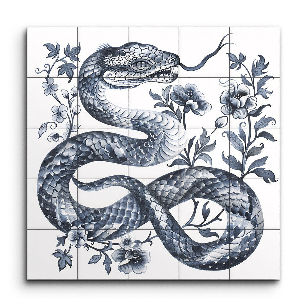 Transform your space with this captivating tile mural, featuring an intricately designed snake coiled in a dynamic pose. The meticulously rendered scales showcase a stunning range of shades, adding a three-dimensional, textured effect. The snake's lively presence is enhanced by its turned head and flicking tongue. Surrounding this majestic creature are delicate floral elements, harmonizing in a monochromatic palette. Reminiscent of traditional tattoo art, this piece balances naturalistic and decorative elements, creating a timeless, visually striking composition.