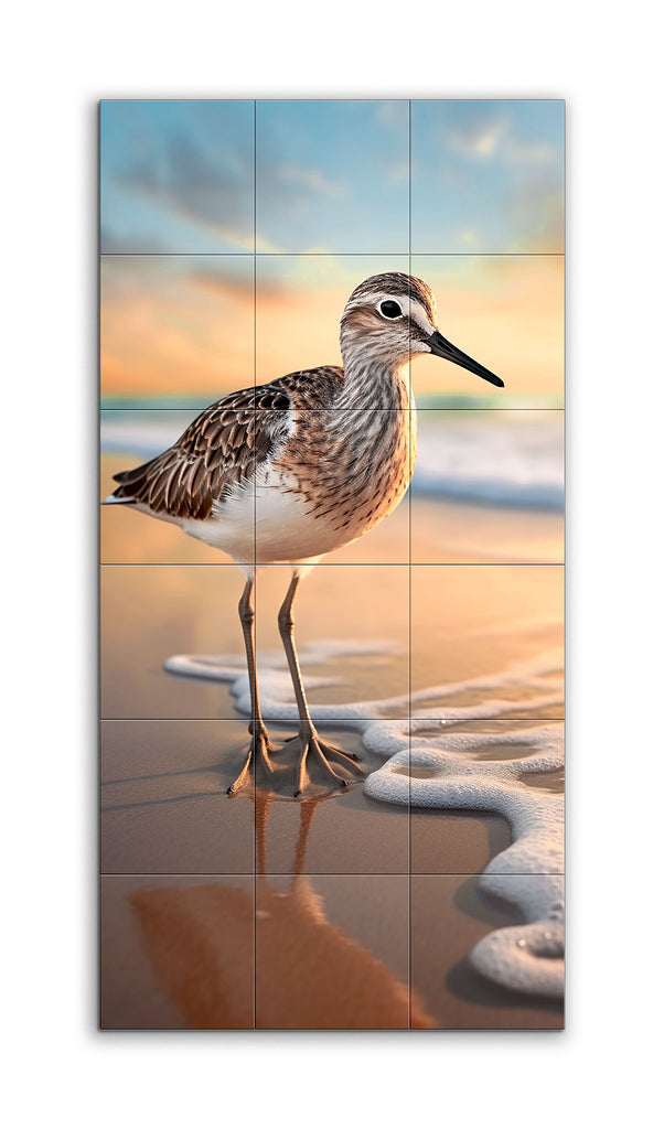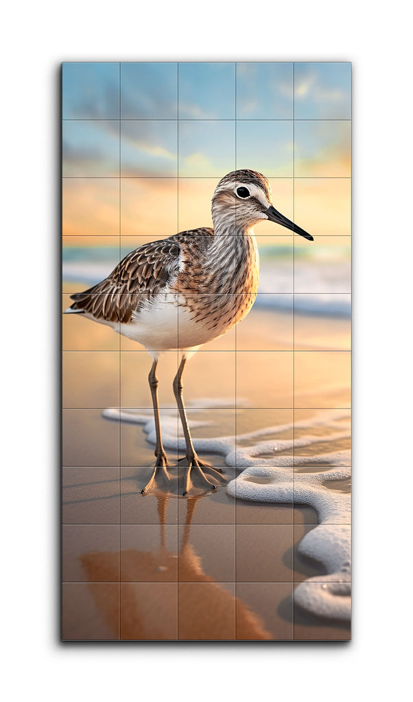 This tile mural captures a serene beach scene at the edge of the water, featuring a detailed shorebird with intricately rendered feathers in brown, white, and black. The bird's lifelike slender legs and beak are complemented by the soft, golden hues of a sunrise or sunset sky. Gentle, frothy ocean waves meet the sandy shore, adding to the tranquil atmosphere. The bird's reflection on the wet sand enhances the depth and realism, creating a peaceful moment in nature with harmonious colors and meticulous detail.