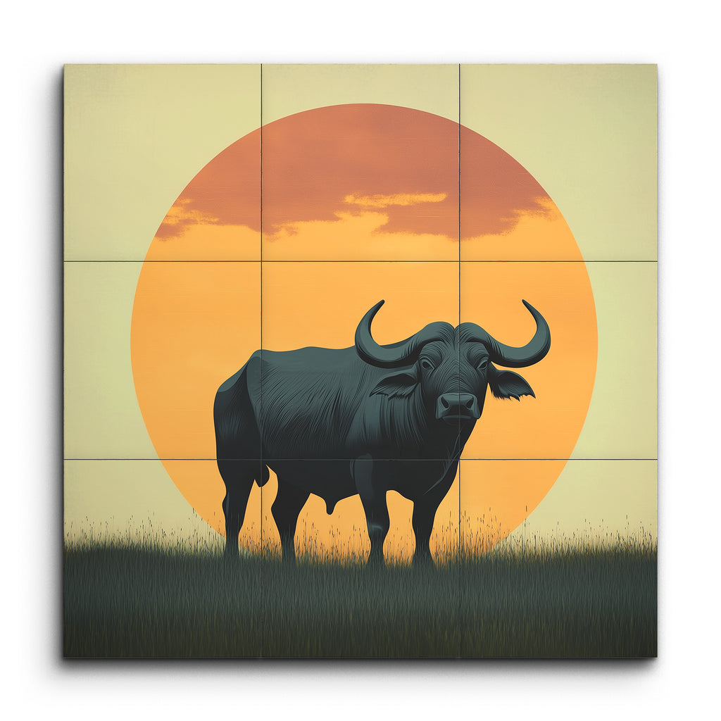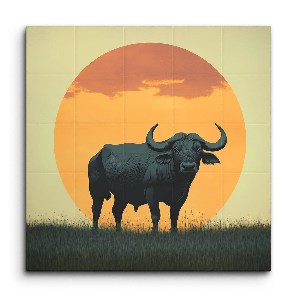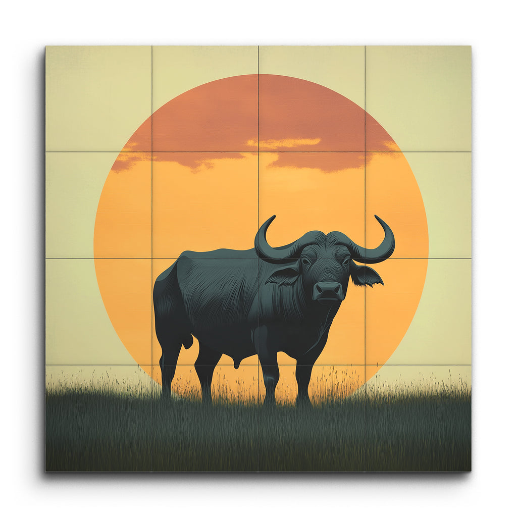 This tile mural showcases a solitary buffalo standing on a grassy plain, rendered in a stylized, surreal manner with smooth lines emphasizing its sturdy build. Dark, muted tones of the buffalo contrast sharply with a vibrant background. A large circular sun, in warm hues of orange and yellow, dominates the upper half, suggesting dawn or dusk with soft clouds adding depth. Fine strokes depict the textured grass, blending realism with abstraction for a modern, graphic yet dreamlike composition.