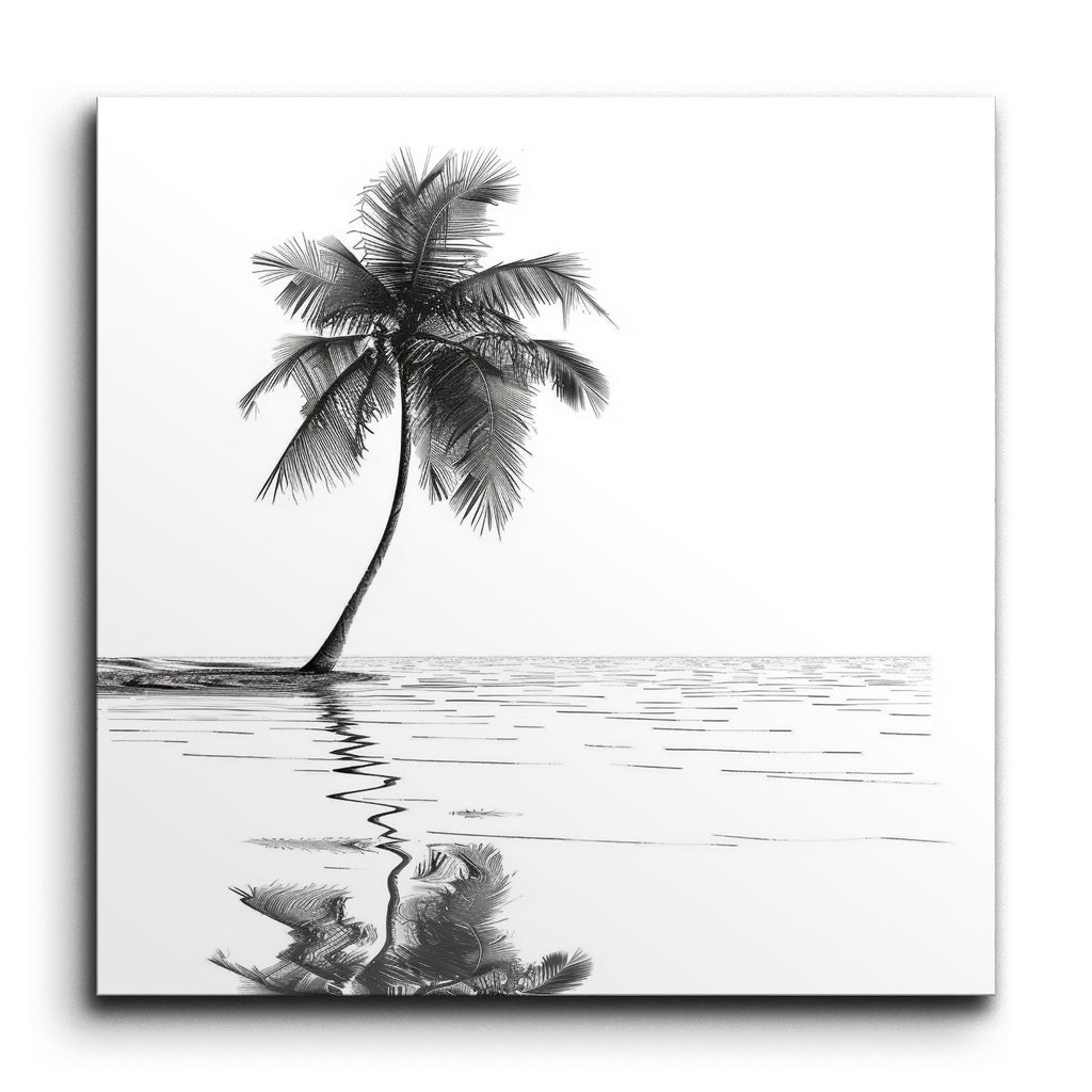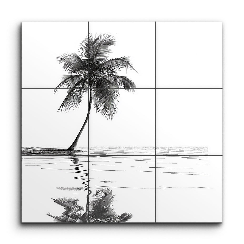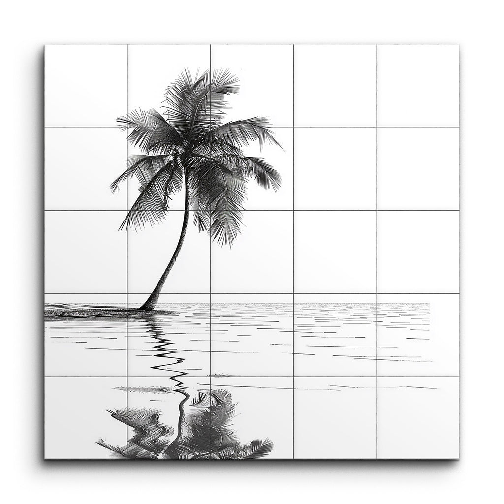 Transform your space with this stunning tile mural featuring a minimalist and monochromatic depiction of a solitary palm tree. The slender, textured trunk and finely detailed leaves create a delicate, natural aesthetic. Below, a calm body of water reflects the tree almost perfectly, with slight distortions adding a sense of gentle movement. The clean, simple style and black-and-white palette enhance the elegance and tranquility of the scene, making it a captivating focal point for any room.