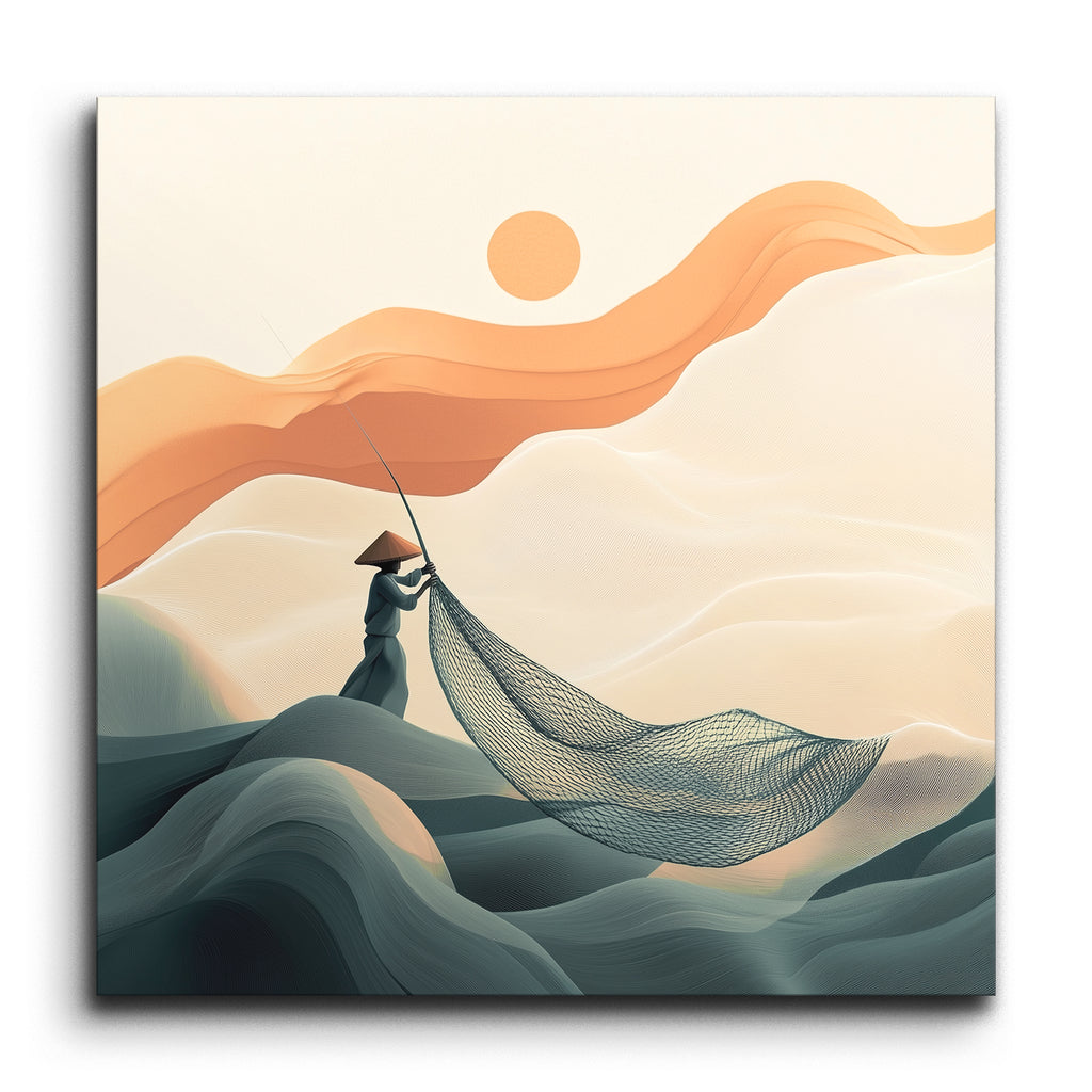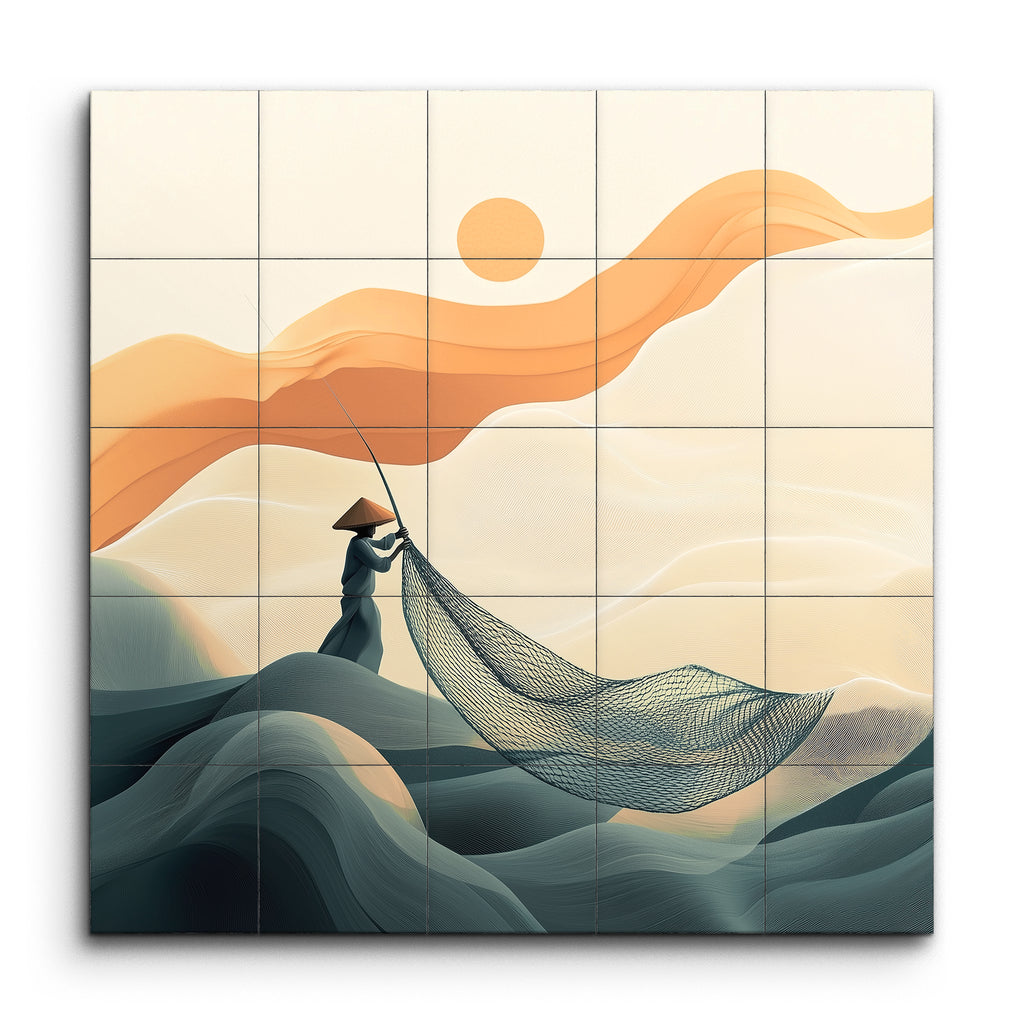 This tile mural showcases a serene, minimalist landscape where a lone figure in traditional Asian attire, complete with a conical hat, stands on gently undulating, wave-like hills. The figure holds a large fishing net, set against a backdrop of smooth, flowing lines in muted green and teal hues. Above, abstract orange and peach shapes float in the sky, suggesting clouds or wind, while a simple round sun adds balance. The modern, minimalist style with harmonious colors evokes peaceful solitude and a deep connection with nature.