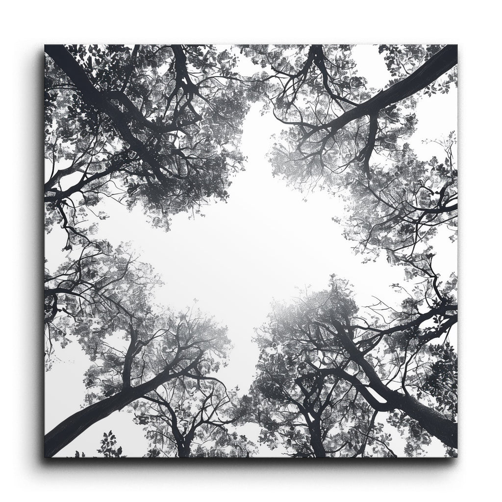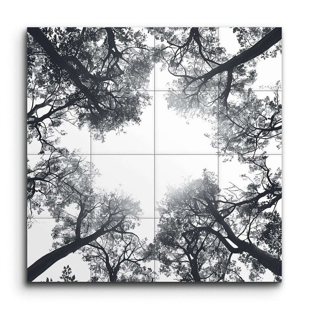 This captivating tile mural captures a mesmerizing upward view of towering trees forming a circular canopy. The branches and leaves converge towards the center, creating a star-like shape in the negative space, drawing the eye inward. Rendered in striking shades of black and gray, the intricate detailing of twigs and leaves adds texture and depth. The minimalist yet detailed design blends natural elements with a modern, abstract composition, making it a dynamic and engaging focal point for any space.