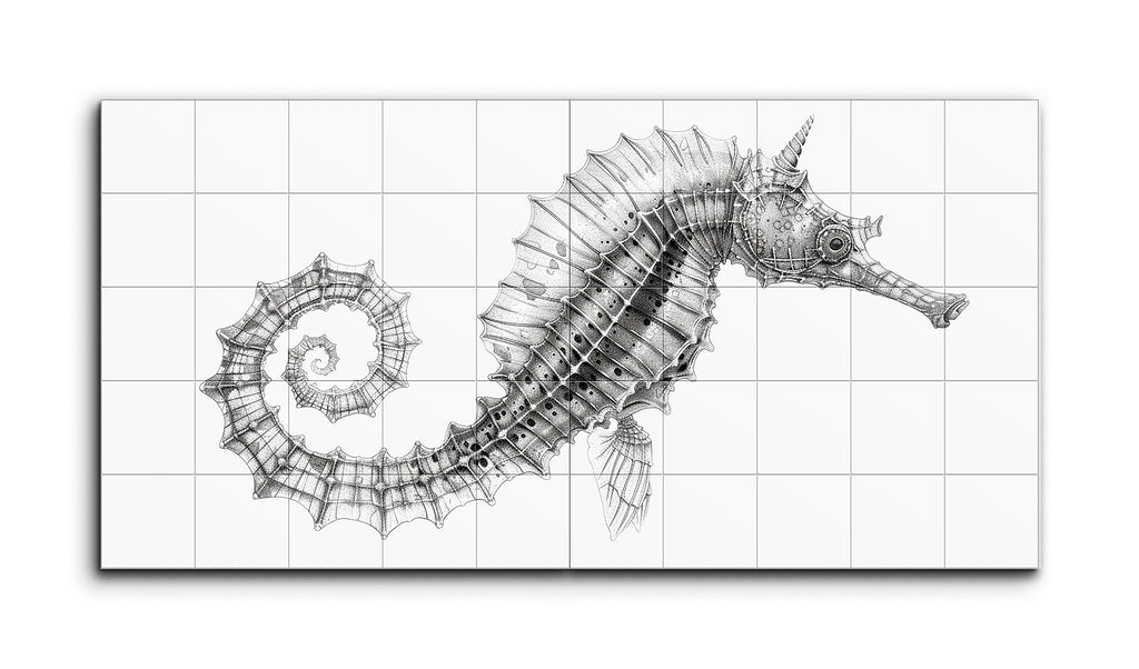 This tile mural showcases a meticulously detailed mechanical seahorse rendered in black and white, emphasizing its stark, graphic quality. Composed of intricate gears, rivets, and articulated segments, the seahorse's body mimics natural segmentation. An ornate, crown-like structure adorns its head, while its elongated snout features concentric circles. The spiral tail and delicately designed fins echo steampunk aesthetics, blending organic life with mechanical engineering for a fantastical, hybrid creature.