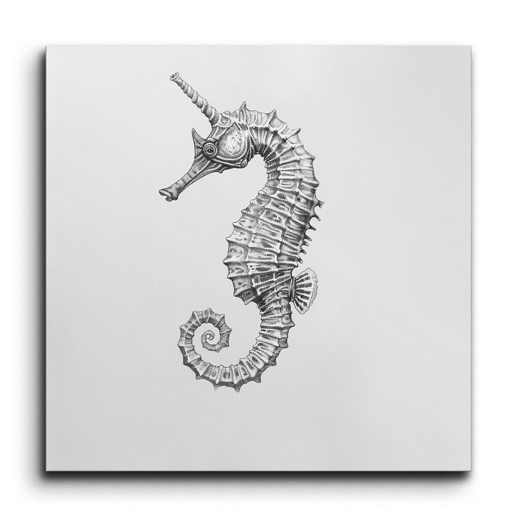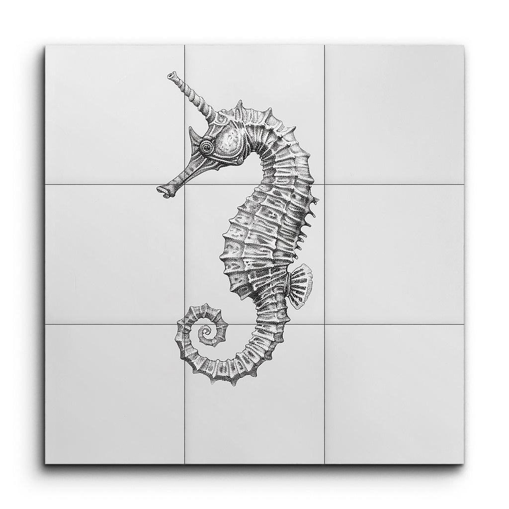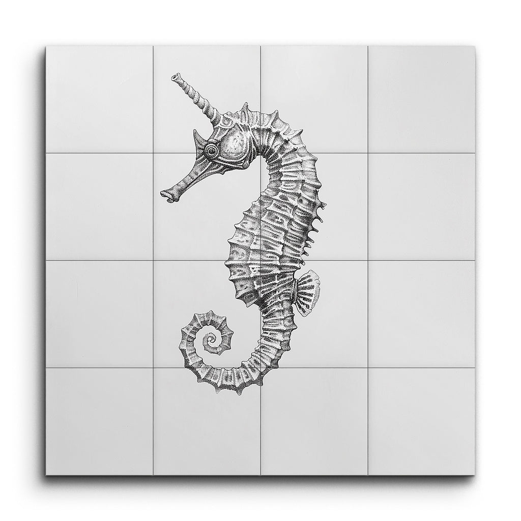 Dive into a world where nature meets innovation with this stunning tile mural featuring a meticulously crafted seahorse. This artwork captures the essence of a steampunk aesthetic, presenting the seahorse in a side profile adorned with intricate metallic parts, gears, and rivets. The segmented body, coiled tail, and fan-like fins are rendered with precise shading and cross-hatching, creating a captivating fusion of biology and mechanical engineering. The monochromatic palette accentuates the industrial charm, making it a unique and visually striking addition to any space.