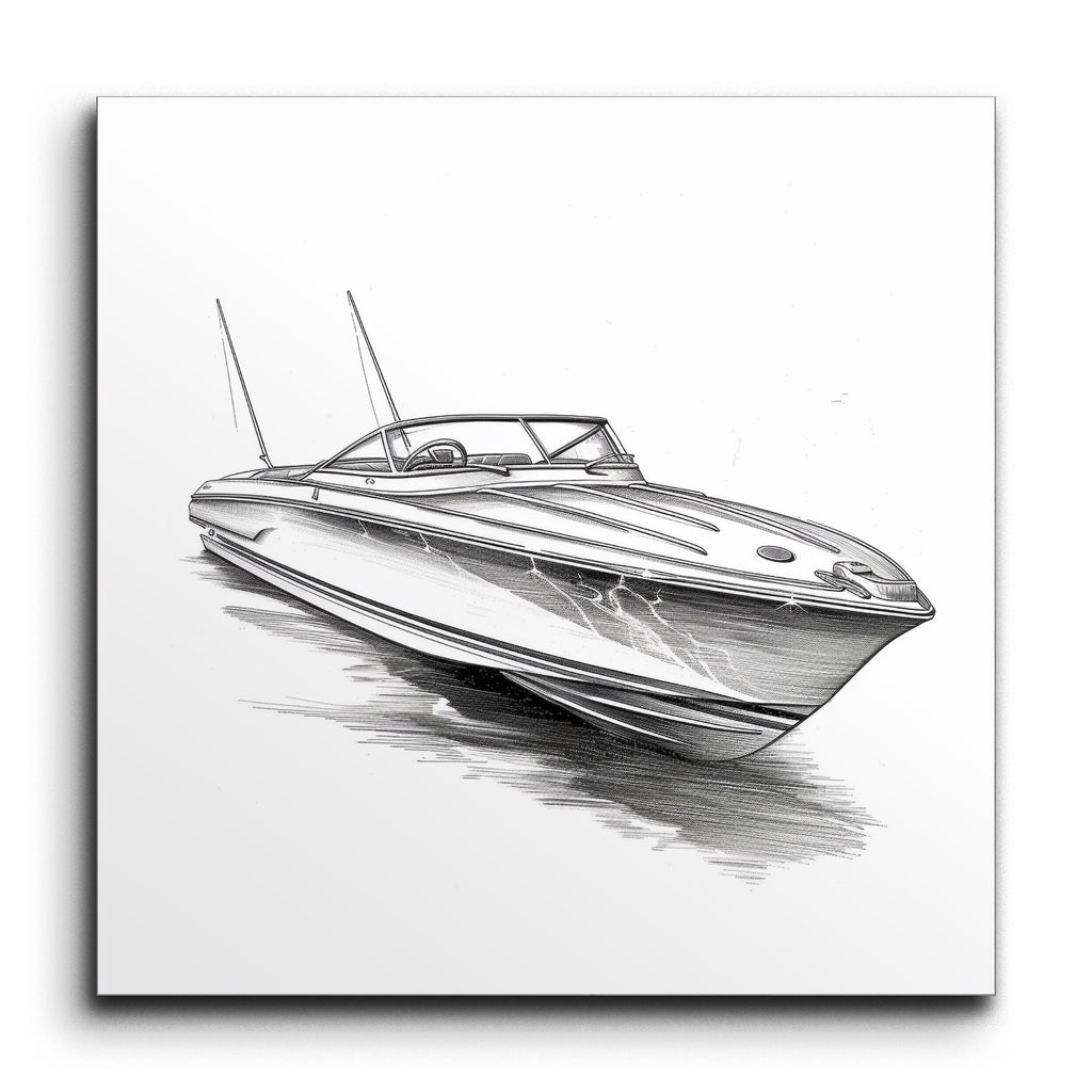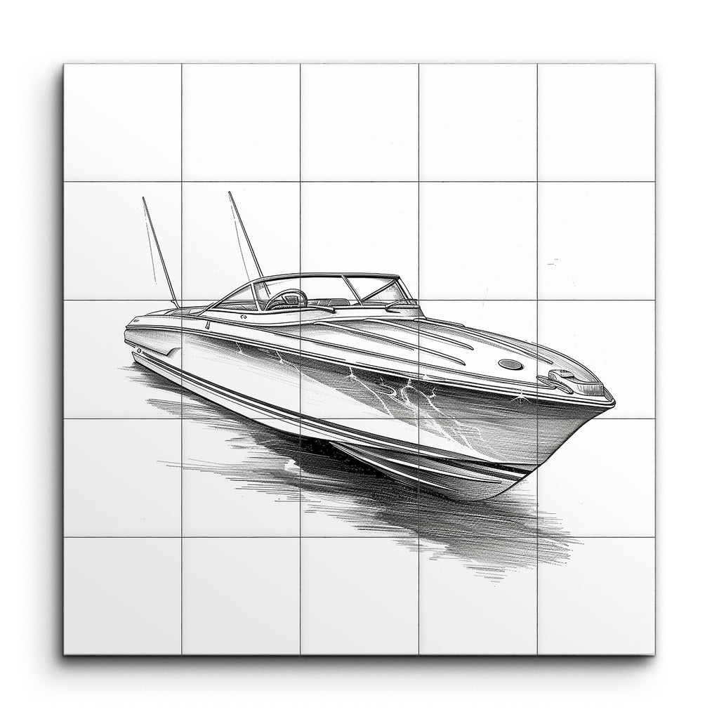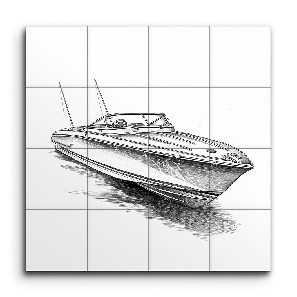 Elevate your space with this captivating tile mural featuring a sleek motorboat in a detailed sketch style. The clean, crisp lines accentuate the boat's aerodynamic shape, while meticulous shading and cross-hatching create a striking three-dimensional effect. The modern, elegant design with smooth curves and a streamlined form is enhanced by the black-and-white contrast, making the artwork pop. Reminiscent of technical drawings, this mural is a testament to precision and artistry.