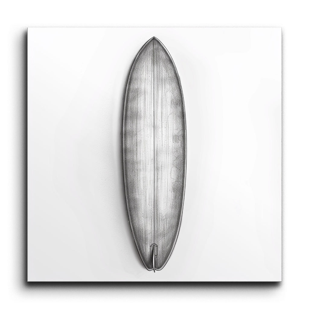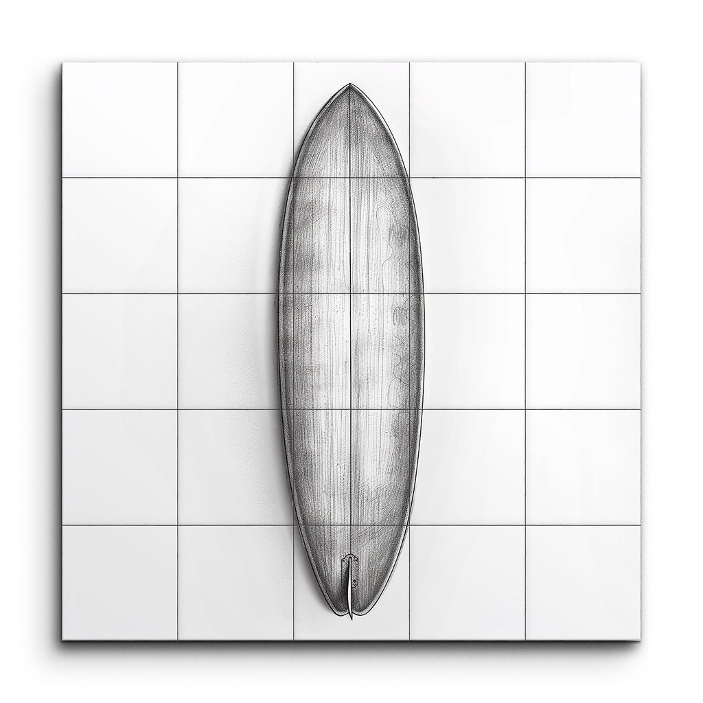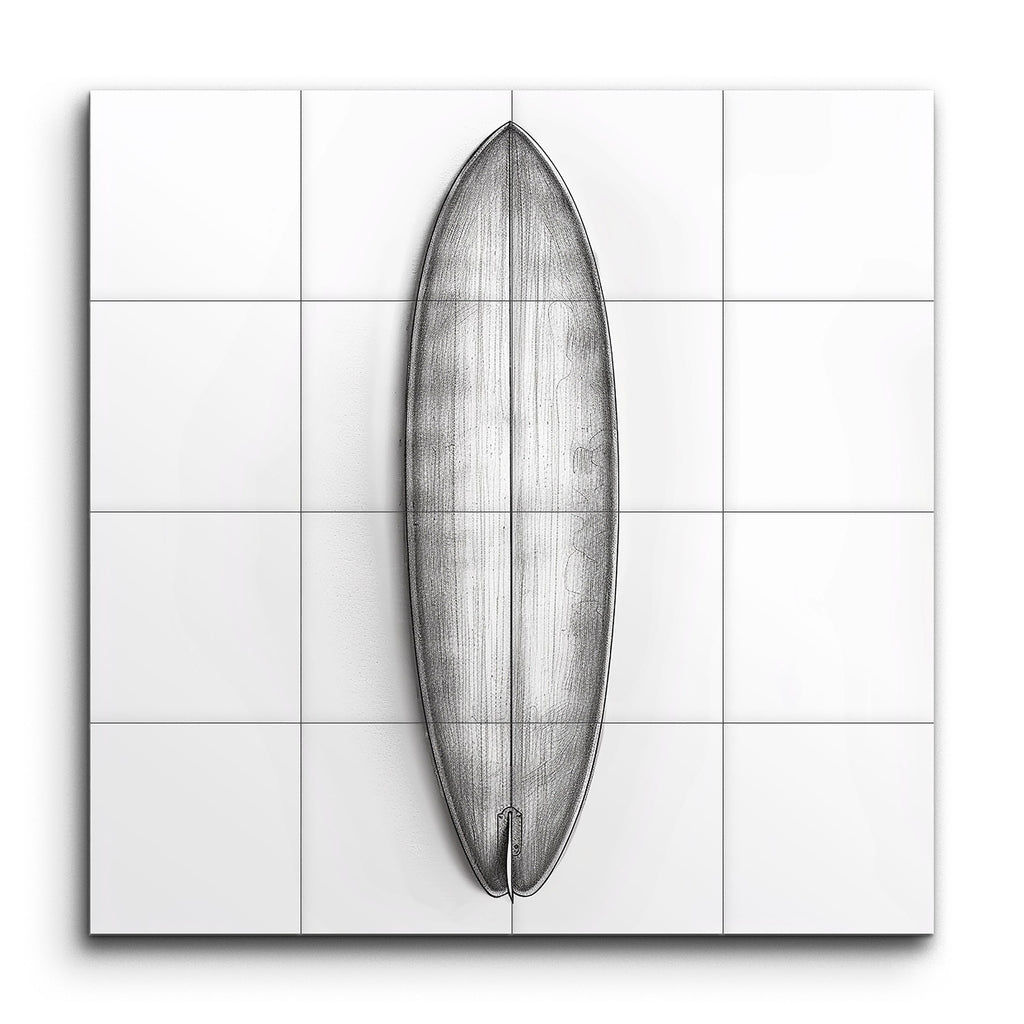 Transform your space with our stunning tile mural, featuring a meticulously detailed surfboard illustration. This artwork captures the elegance of surfboard design, presenting it from a top-down view to showcase its elongated, streamlined shape. The pointed nose and rounded tail, complete with a single fin, are rendered with fine lines and expert shading to create a three-dimensional effect. The minimalist, monochromatic palette enhances the form and structure, embodying a technical, architectural aesthetic. Perfect for surf enthusiasts and lovers of finely crafted design.
