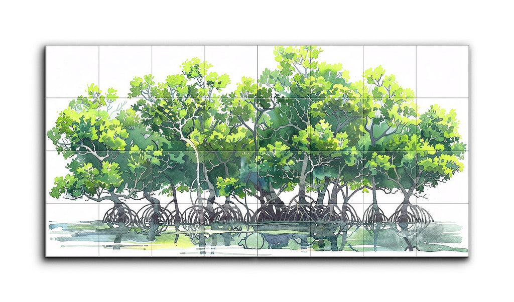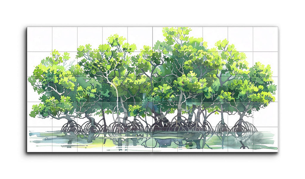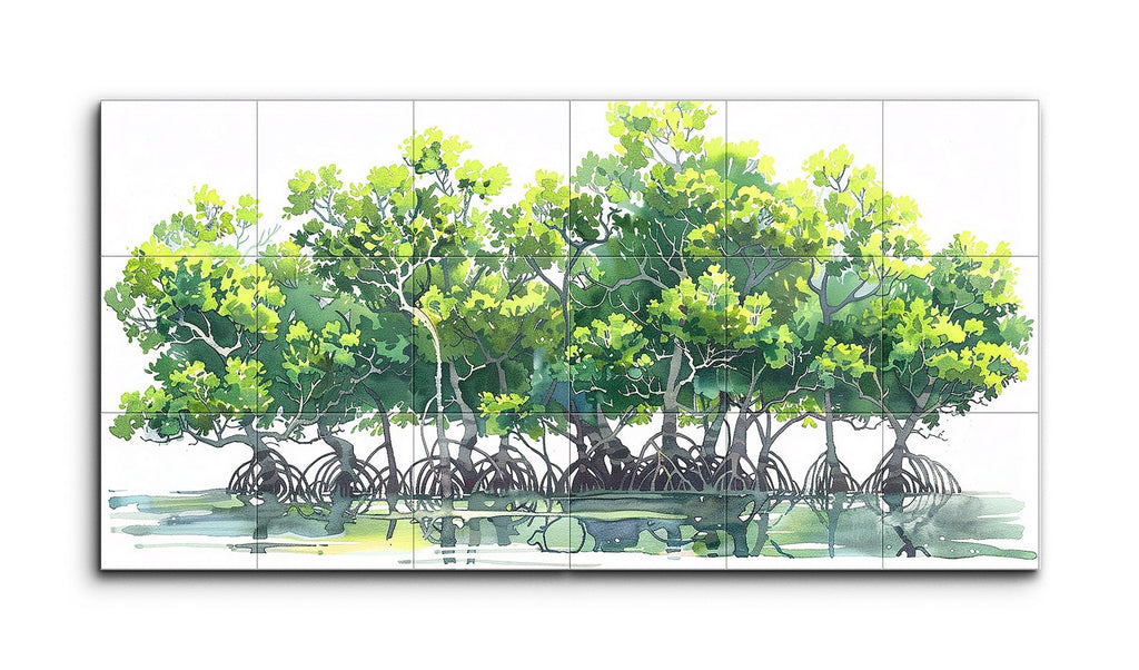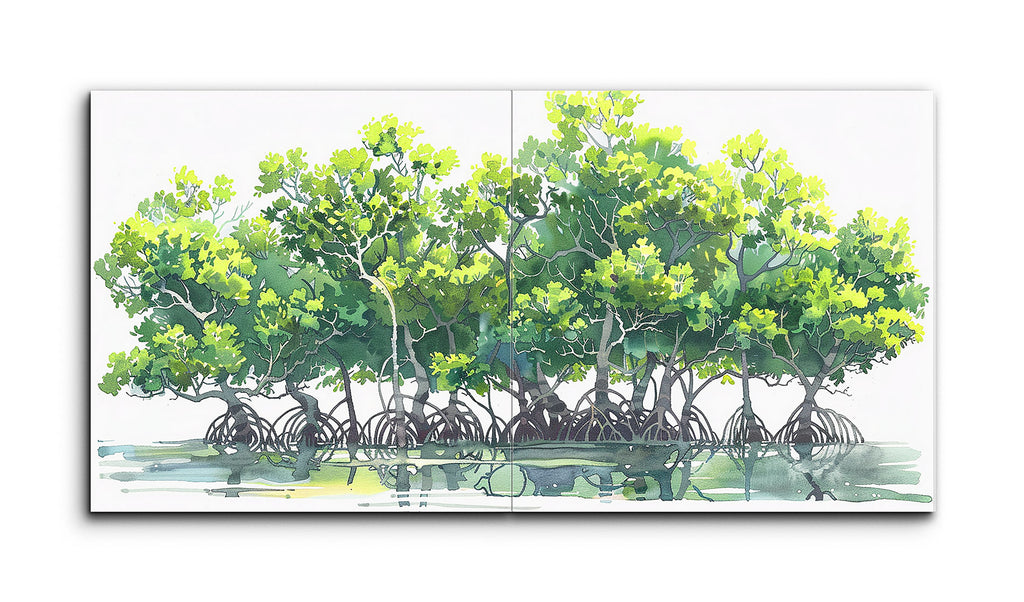 This diptych artwork features a group of mangrove trees, focusing on their dense, intricate roots. The trees are depicted with a blend of realism and impressionistic brushstrokes, using vibrant greens and yellows to suggest a sunlit environment. The darker tones of the roots contrast with the lighter water and foliage, highlighting the root structure. Broad strokes of blues and greens represent the water, creating a calm, reflective surface that mirrors the trees. The piece captures the lush vitality of a mangrove ecosystem.