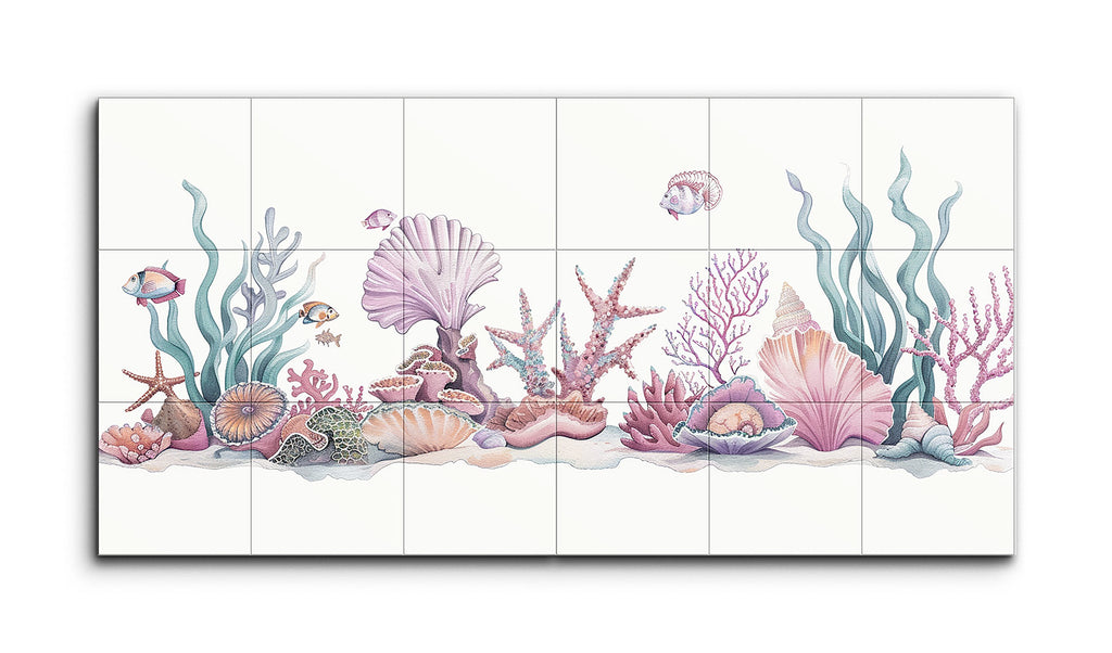 This tile mural showcases an enchanting coastal village at sunset. Vibrant hues of orange and pink fill the sky, reflecting off the tranquil sea. Quaint houses with terracotta roofs line the shore, surrounded by lush greenery. Sailboats gently bob in the harbor, while distant mountains add depth to the serene landscape. This piece captures the idyllic charm and peaceful atmosphere of seaside living.