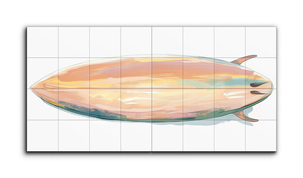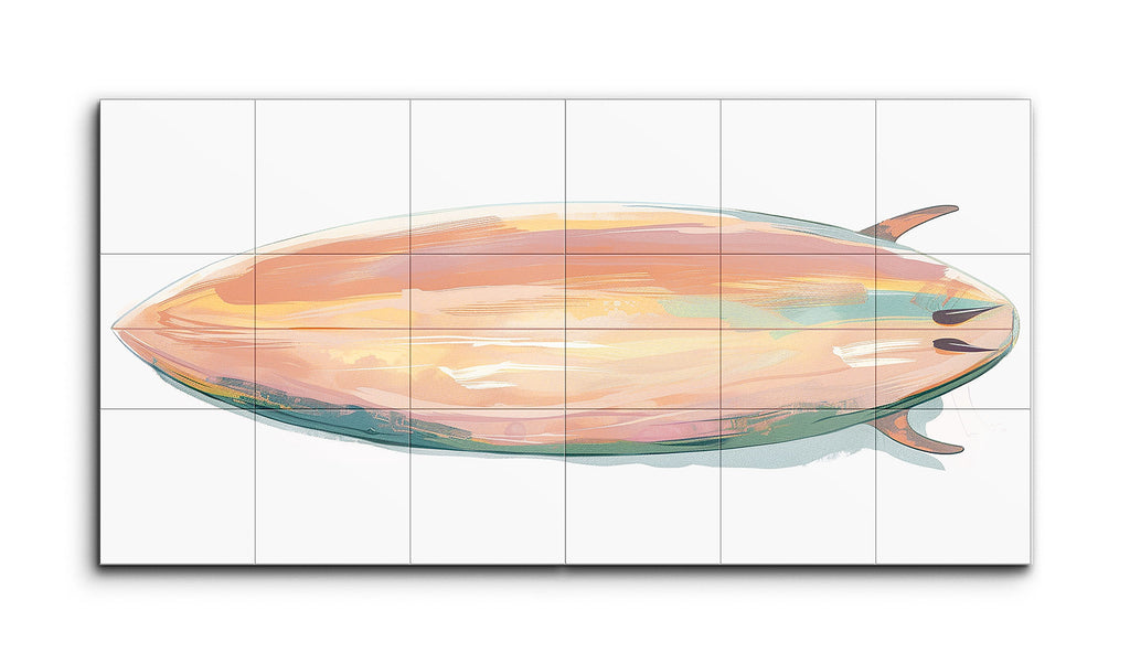This diptych tile mural features a stylized surfboard that spans across two panels, creating a harmonious composition. The surfboard is rendered in a modern, minimalist style with smooth, flowing lines that outline its form. A soft, pastel color palette of peach, pink, yellow, and light blue blends seamlessly, evoking the serene ambiance of a sunrise or sunset. The abstract design focuses on color and shape, with simplified details that invite contemplation. The diptych format introduces a visual break, adding depth and intrigue to the piece.