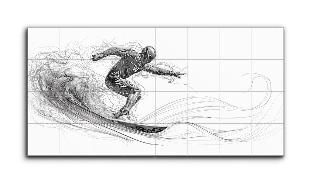 This tile mural captures a dynamic scene of a surfer riding a wave with intricate detail. Fine lines convey motion and fluidity, emphasizing the surfer's realistic anatomy and balanced posture. The expressive lines of the wave and water spray swirl around the surfer, creating a vivid sense of movement and energy. The balanced composition, with the surfer slightly off-center, enhances the feeling of speed. The monochromatic black and white color scheme adds a graphic and modern touch.