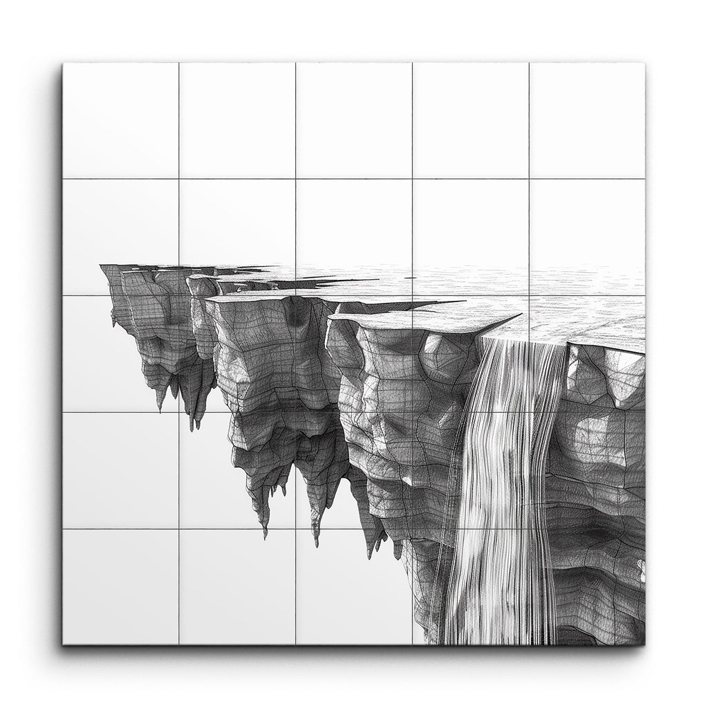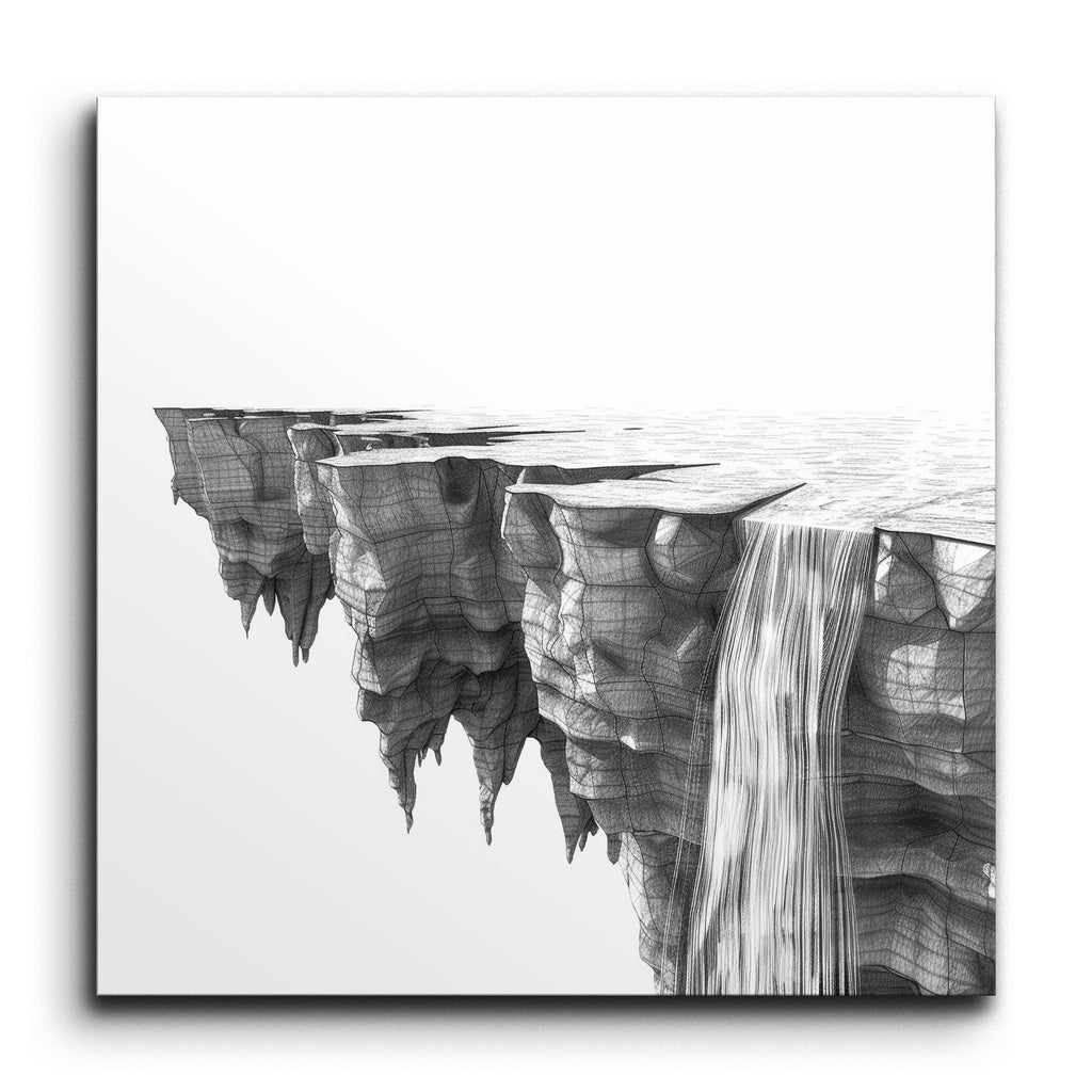 Transform your space with this captivating tile mural, featuring a surreal and minimalist depiction of a cliff with a cascading waterfall. The detailed, topographical style of the cliff showcases intricate lines and shading, creating a textured, three-dimensional appearance. Jagged and irregular edges evoke natural erosion, while the smooth, flowing waterfall adds a striking contrast. The monochromatic tones emphasize form and texture, making this artwork an eye-catching focal point in any setting.