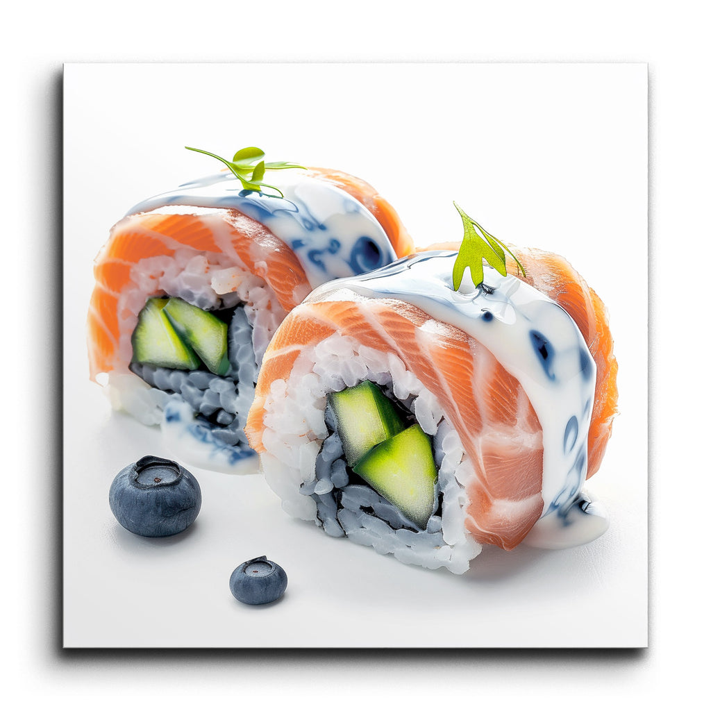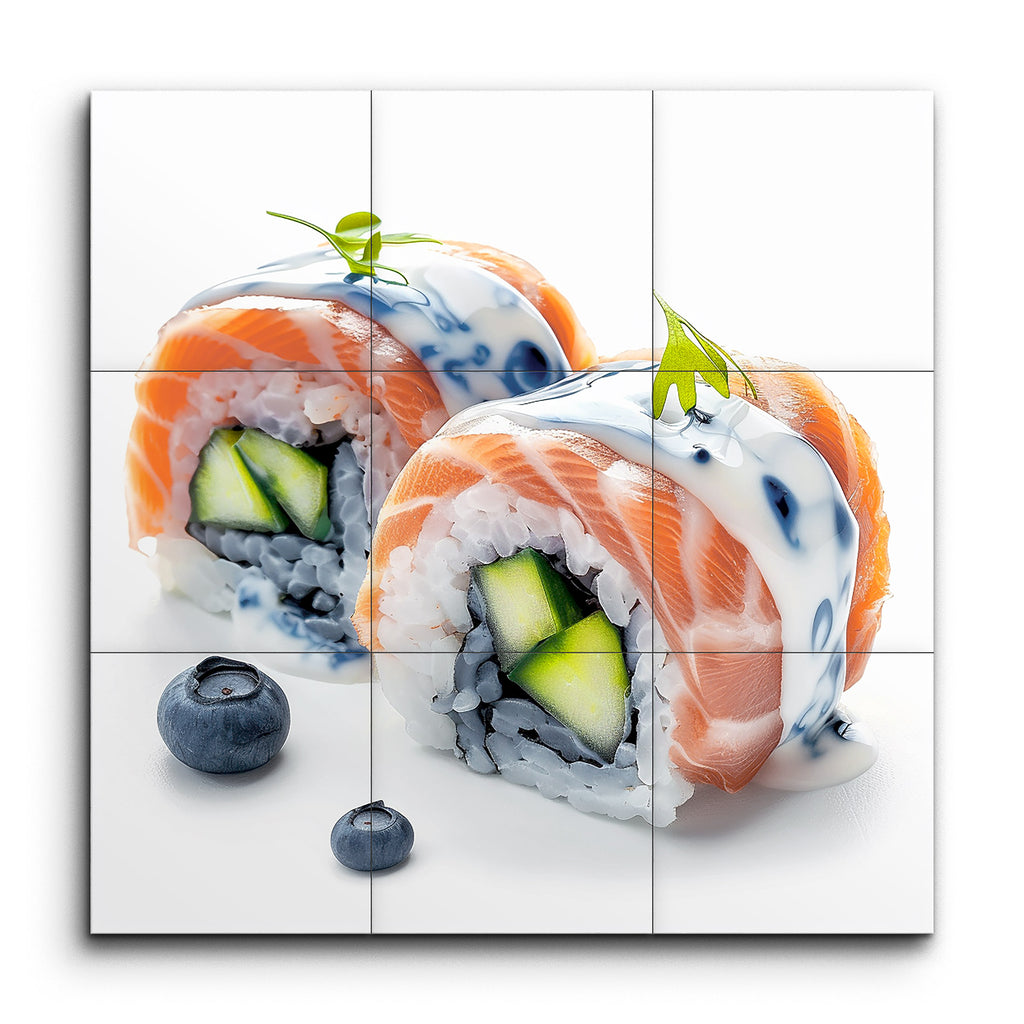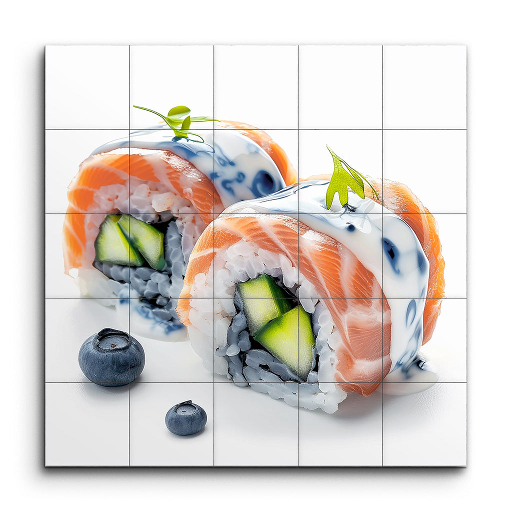 Elevate your space with this captivating tile mural, showcasing a hyper-realistic depiction of two sushi rolls. The intricate details bring the layers of fresh salmon, fluffy rice, and crisp cucumber to life. A dynamic drizzle of creamy white sauce with blue streaks adds a modern flair, while green leaf garnishes enhance the visual appeal. Unexpectedly, three glossy blueberries in the foreground inject a playful twist. This artwork blends realism with contemporary elements, making it a visually striking and appetizing masterpiece.