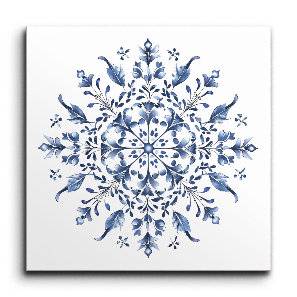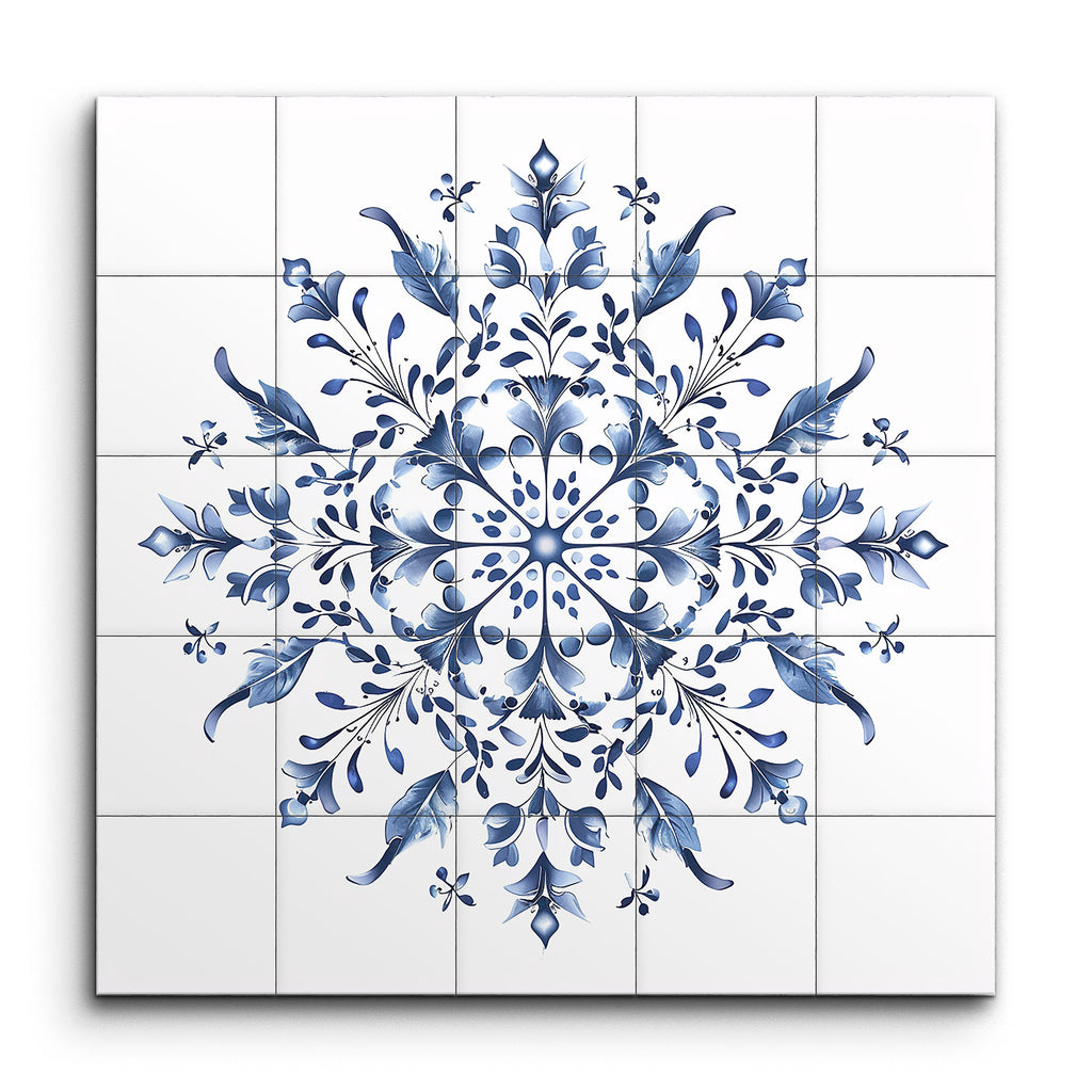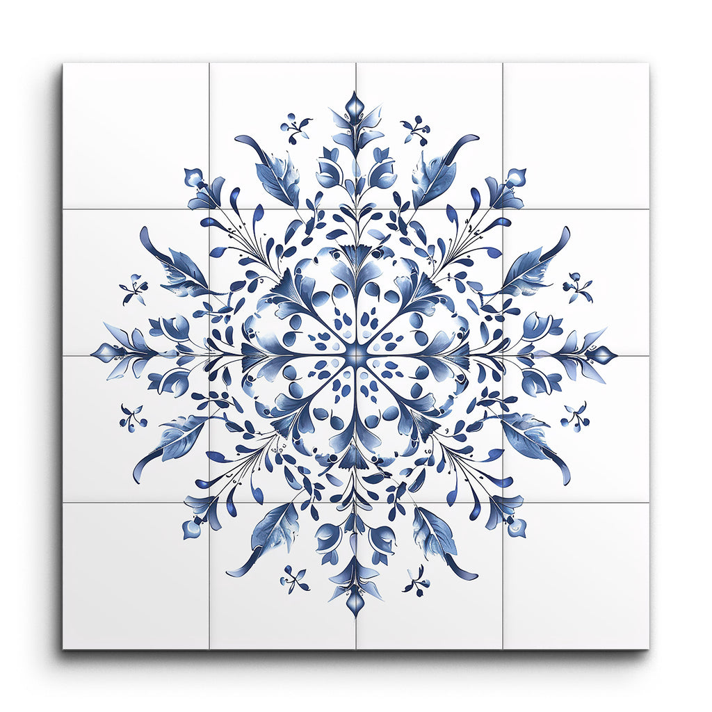 Transform your space with this mesmerizing tile mural featuring a highly detailed, symmetrical mandala design in soothing shades of blue. The artwork radiates balance and harmony, with intricate floral and botanical elements such as leaves, petals, and buds arranged in a circular formation. The use of gradients and shading adds a three-dimensional depth, while delicate curves and fine lines contribute to its elegance. Reminiscent of traditional folk art with a modern twist, this piece is visually captivating and aesthetically pleasing.