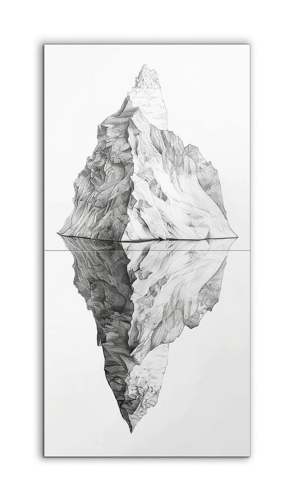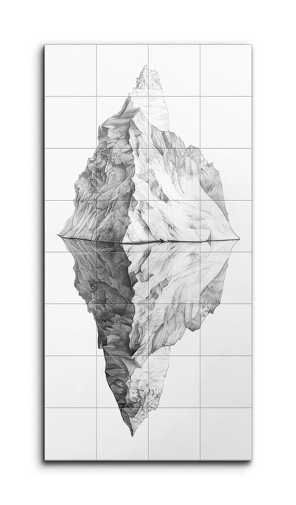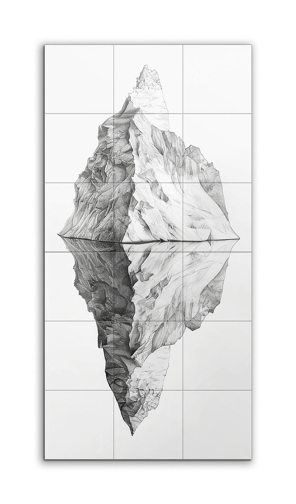 This tile mural features an intricately detailed black and white depiction of a mountain peak, perfectly mirrored below to create a symmetrical composition. The fine line work and shading highlight the rugged textures and contours of the rocky surface. The realistic style and meticulous detail capture the natural beauty of the mountain, while the monochromatic palette lends a timeless and classic feel to the piece. The precise reflection adds a striking and balanced visual effect.