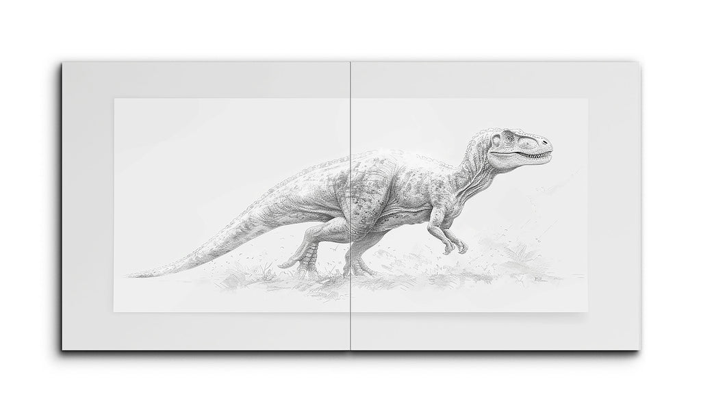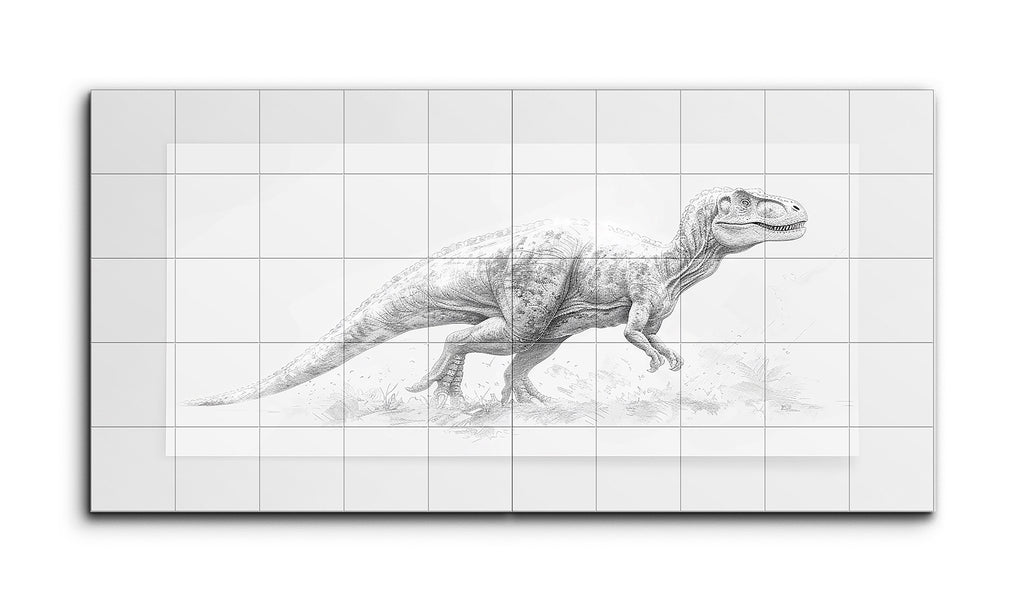 This tile mural features a monochromatic illustration of a theropod dinosaur in a dynamic, mid-stride pose. The highly detailed artwork captures the texture of the dinosaur's skin, muscles, and scales with fine lines and intricate shading. The lifelike depiction of the dinosaur's head, including its skull, teeth, and eye, showcases the artist's attention to realism. A minimalistic background with light shading keeps the focus on the dinosaur, evoking the style of classic scientific illustrations.