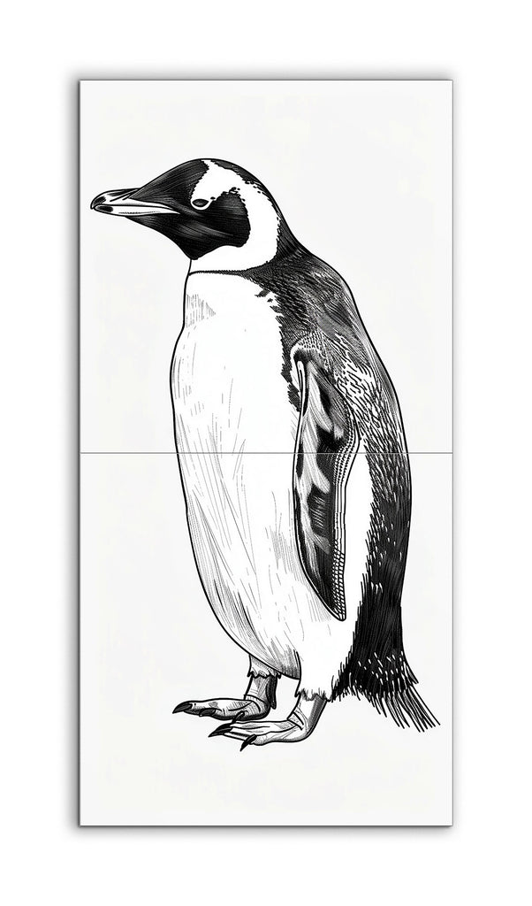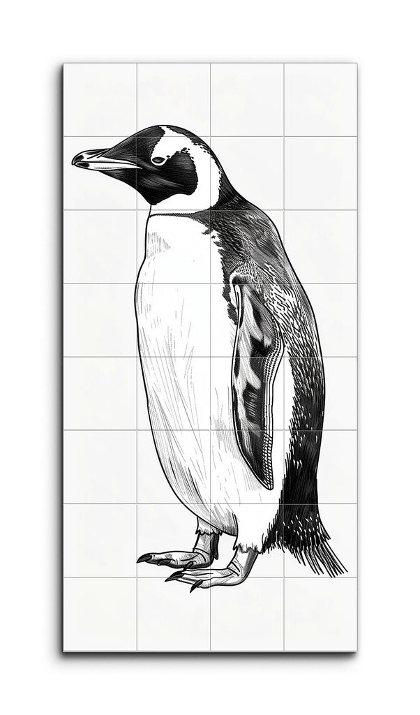 This tile mural features a meticulously detailed black and white illustration of a standing penguin, facing left. The artwork captures the natural texture of the penguin's feathers and distinct body markings with precision. The head and beak are intricately drawn, highlighting the bird's characteristic features. The shading and fine line work add depth and dimension, creating a realistic portrayal. The classic black and white palette lends a timeless quality to this beautifully detailed depiction.