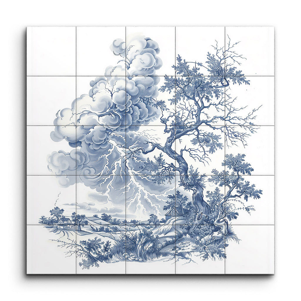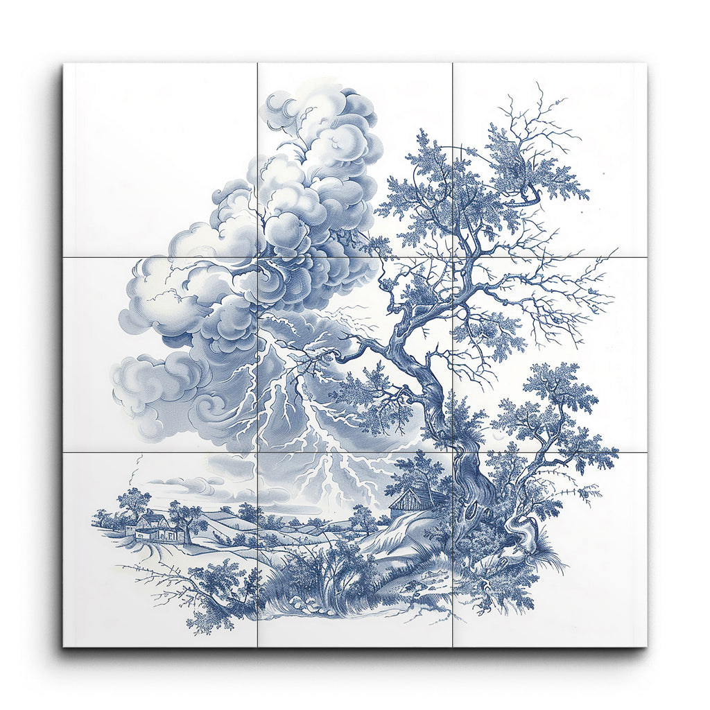 Immerse yourself in the timeless elegance of this monochromatic blue tile mural, reminiscent of traditional blue and white porcelain or Delftware. The scene captures a dramatic landscape dominated by a gnarled, intricately detailed tree, symbolizing age and resilience. A stormy sky with swirling clouds and vivid lightning bolts adds intensity, while rolling hills and smaller trees provide depth. The harmonious blue palette accentuates the intricate details, portraying nature's beauty and power in a moment of turmoil.