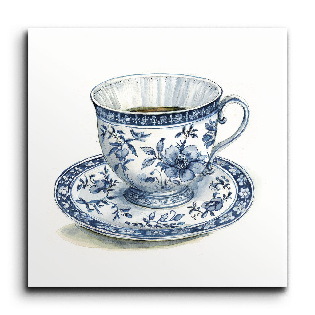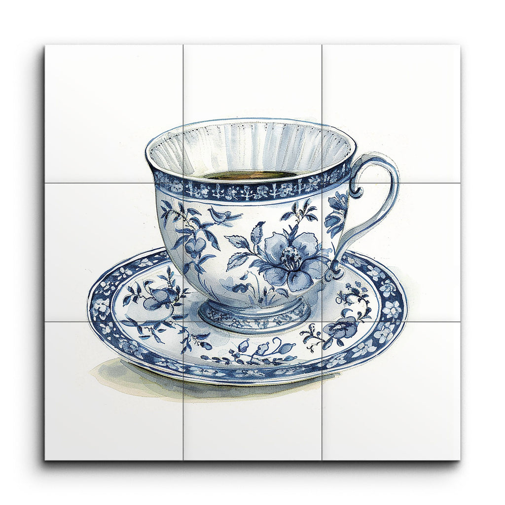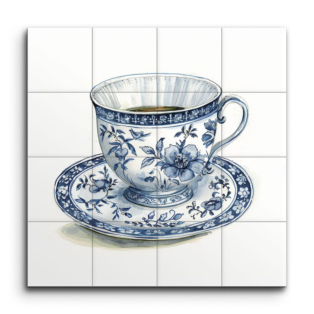 Transform your space with this stunning tile mural, showcasing an exquisite teacup and saucer set in classic blue and white. Intricate floral patterns of blooming flowers and leafy vines adorn the finely detailed teacup, with a gracefully curved handle enhancing its refined look. The matching saucer features elegant floral motifs along its perimeter, drawing attention to the detailed edges. Reminiscent of traditional Delftware or Chinese porcelain, this artwork exudes timeless elegance and sophistication.