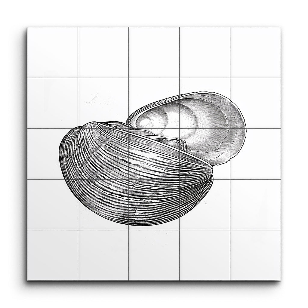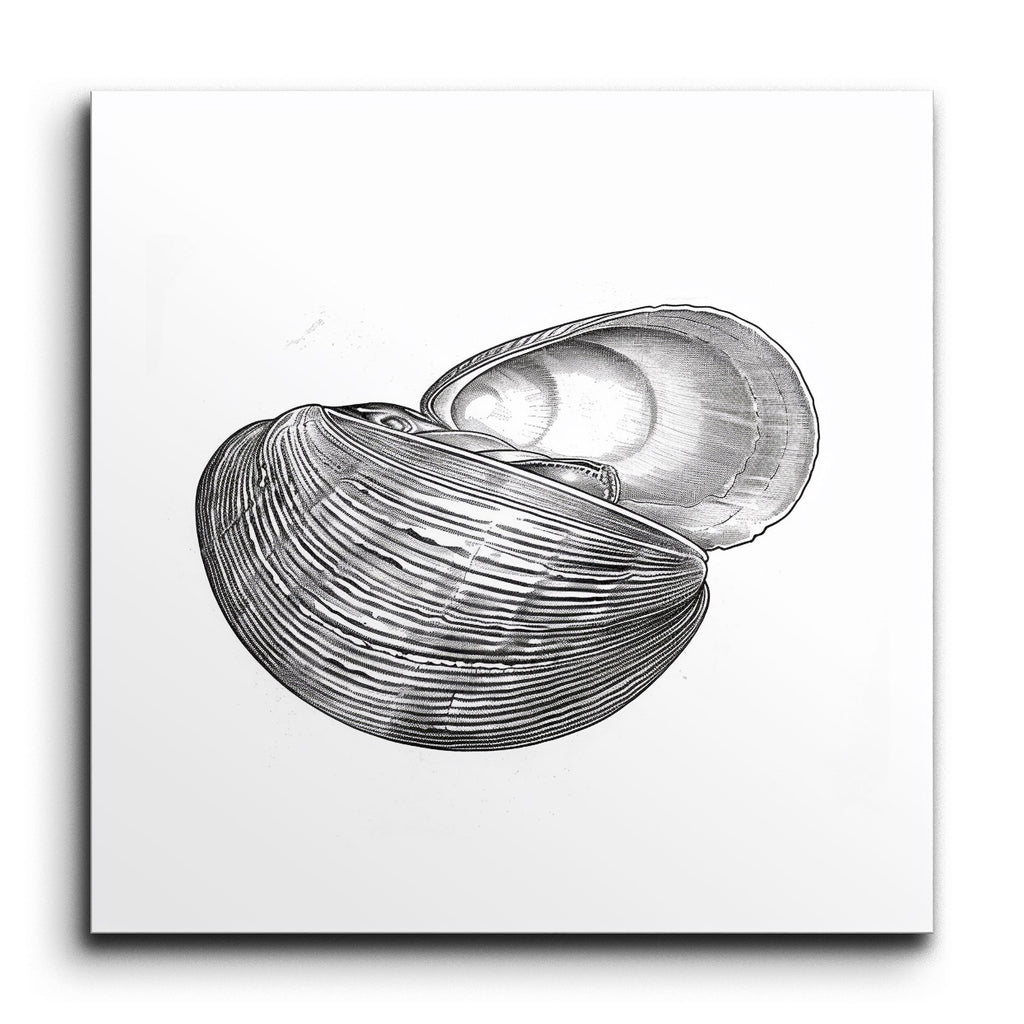 Transform your space with this captivating tile mural, featuring a meticulously detailed black and white illustration of an open clam shell. The artwork presents one half of the shell slightly ajar, revealing its smooth inner surface. Intricate parallel lines on the outer shell and subtle shading on the inner create a realistic, three-dimensional effect. This piece, reminiscent of scientific illustrations, exudes timeless elegance, celebrating the natural beauty and structure of the clam shell.