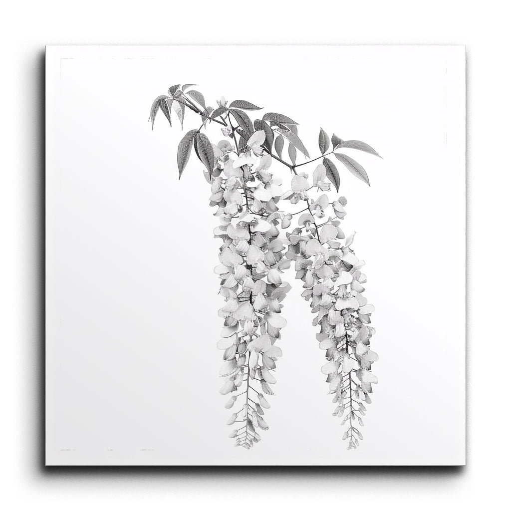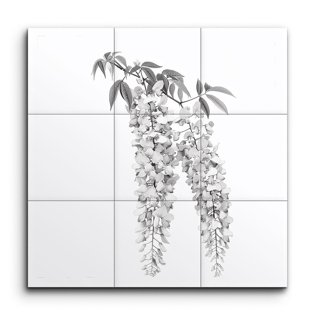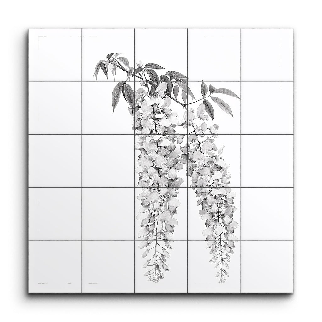 Immerse your space in timeless elegance with this captivating tile mural, showcasing a meticulously illustrated hanging wisteria plant. Rendered in monochromatic grayscale, the artwork highlights cascading clusters of blossoms with intricate petal details and carefully veined leaves. The realistic style, emphasized by fine lines and shading, creates a sense of depth and dimension, celebrating the natural beauty of the wisteria. This piece brings a touch of sophistication and tranquility to any setting.