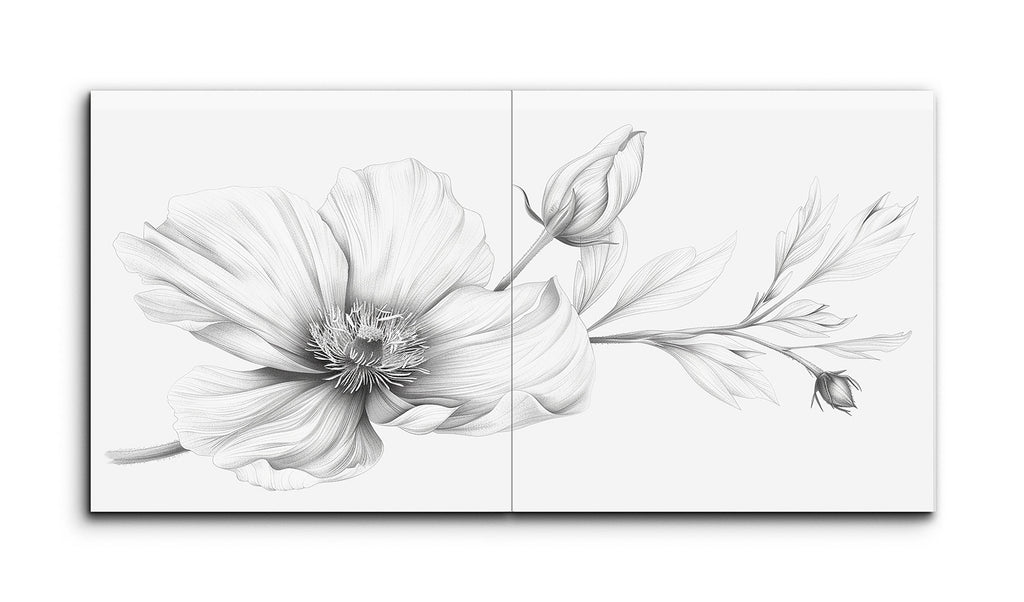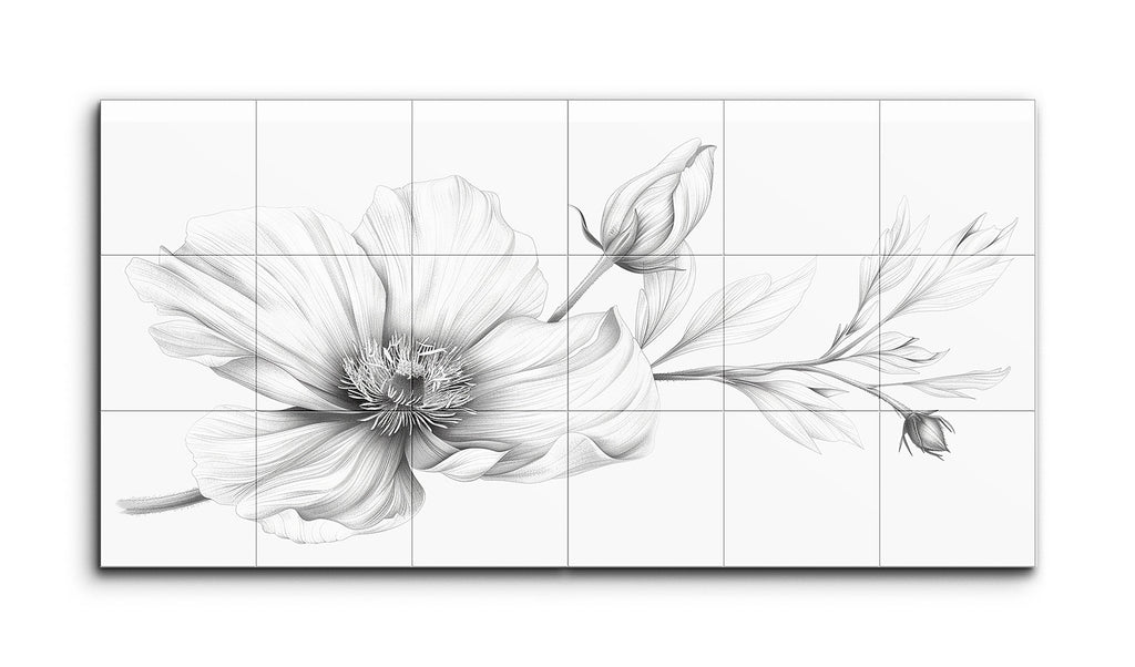 This tile mural features a meticulously detailed black and white pencil drawing of a flower. The central bloom, with its intricately drawn petals, showcases fine lines and shading, creating a sense of depth and texture. Smaller buds and slender leaves extend to the right, each at different stages of opening, adding a sense of growth. The realistic botanical style emphasizes precision, with monochrome tones lending a timeless elegance to the composition. The balanced design highlights the natural curves and folds of the flower and its elements.