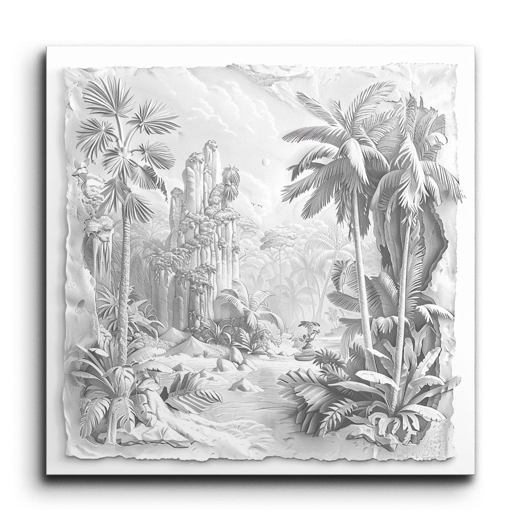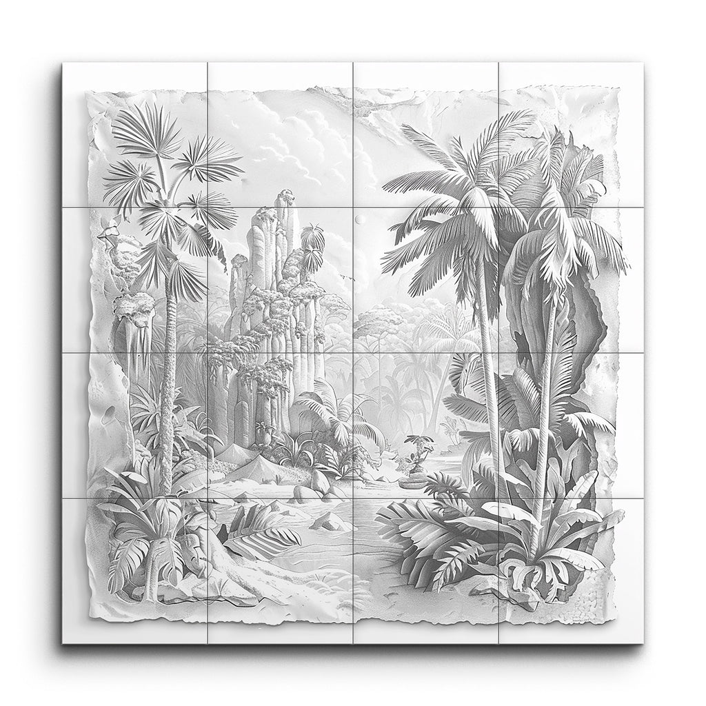 Immerse yourself in the timeless beauty of a lush jungle with this intricate grayscale tile mural. The highly detailed illustration captures the essence of a thriving tropical ecosystem, featuring tall palm trees, dense undergrowth, and towering rock formations. Soft, wispy clouds in the background offer a gentle contrast to the rich textures and patterns of the foliage. Reminiscent of classical etching, the meticulous shading and fine lines create a sense of depth, inviting you to explore every corner of this enchanting scene. The slightly irregular edges enhance its antique quality, making it a captivating focal point for any space.