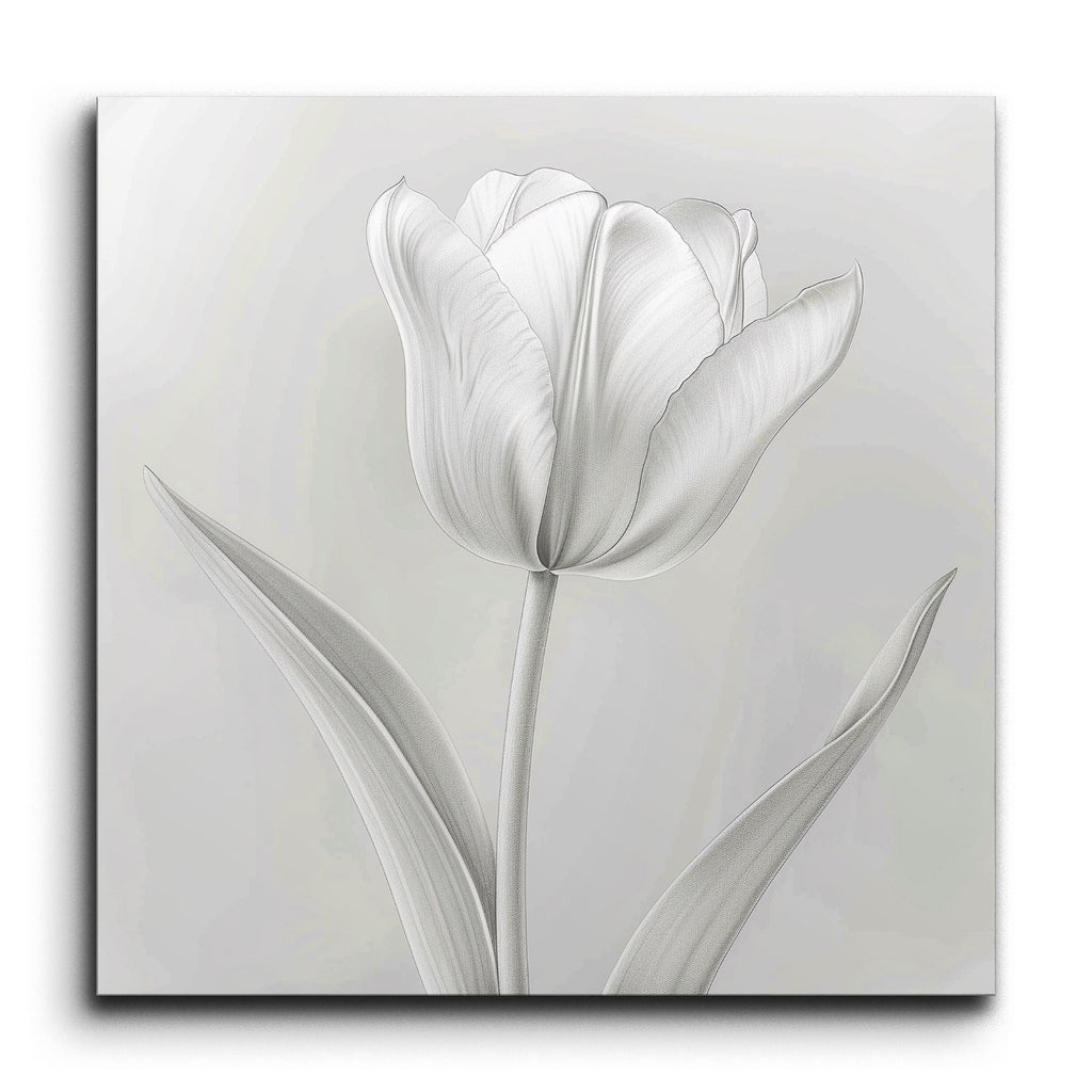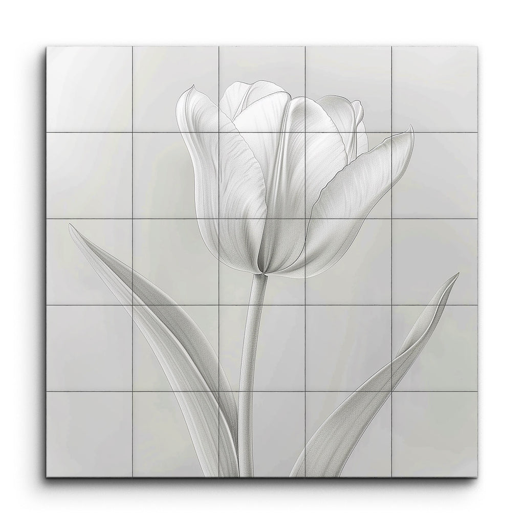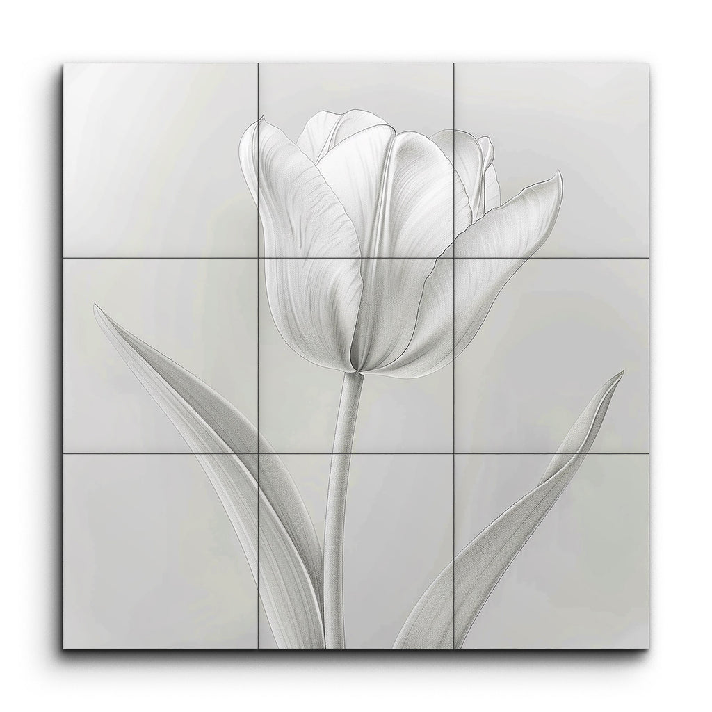 This exquisite tile mural captures the timeless elegance of a single tulip flower, rendered in a sophisticated grayscale palette. The tulip, shown in full bloom, showcases intricately detailed petals with a soft, almost translucent quality. The slender stem and gently curving leaves, meticulously shaded, add a natural and organic texture. The highly realistic style focuses on the delicate nuances of the tulip's form, creating a harmonious and balanced composition that exudes simplicity and refined beauty.