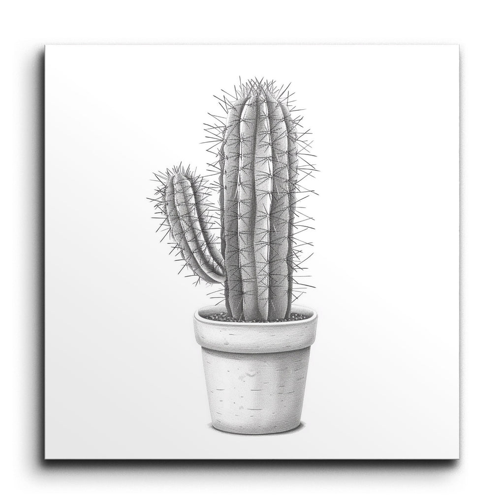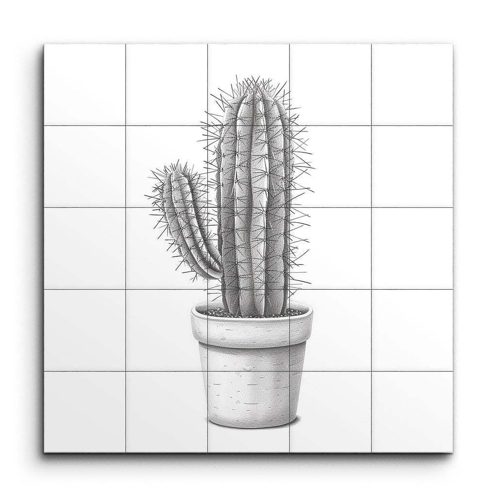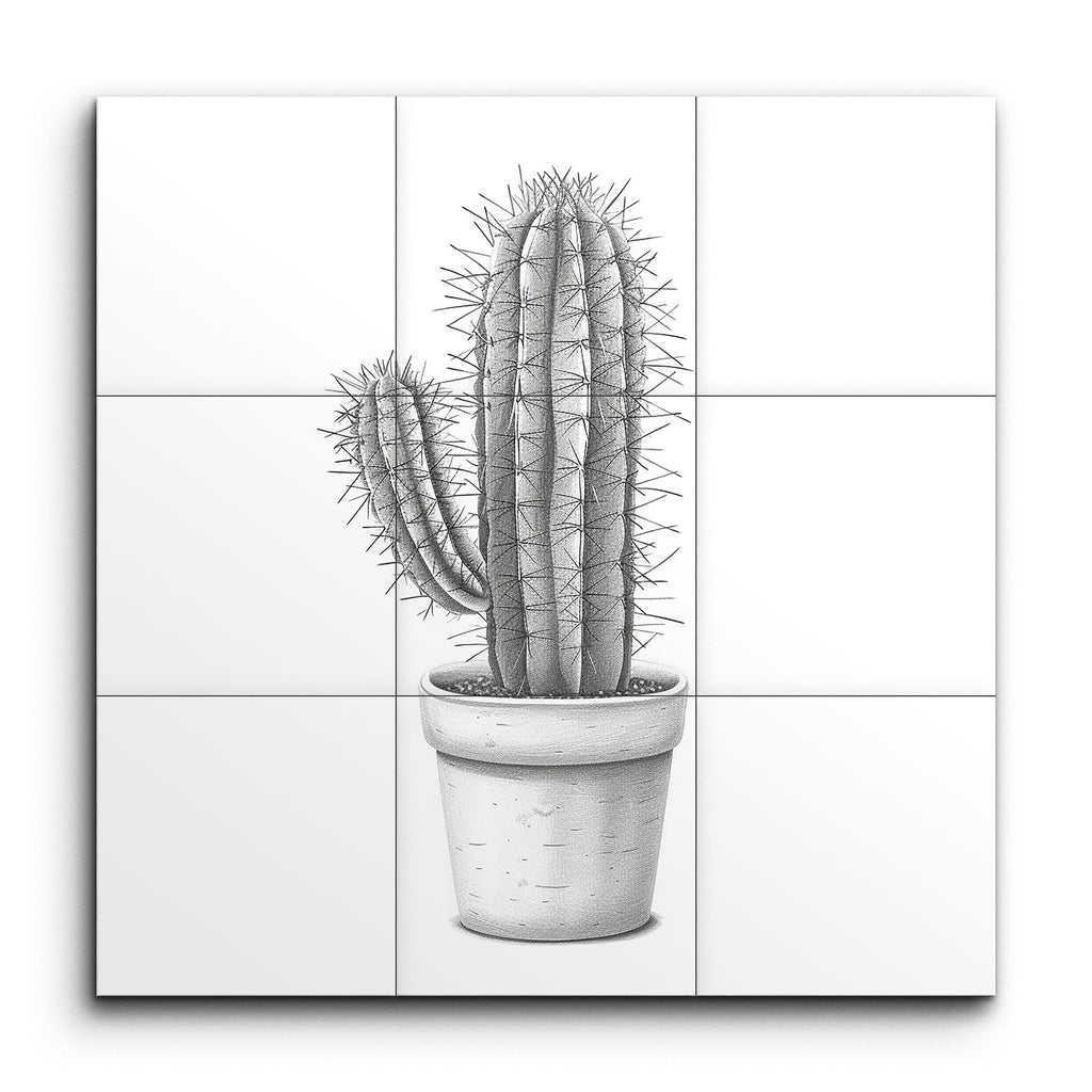 This tile mural features an exquisitely detailed monochromatic illustration of a cactus in a pot. The primary column of the cactus stands tall and robust, accompanied by a smaller, secondary column, showcasing natural growth and variation. Each spine is meticulously drawn to highlight sharpness and texture, while the cylindrical pot, with its subtly shaded rough surface, adds depth and realism. The grayscale palette lends a timeless, classic feel, allowing the intricate details to shine.