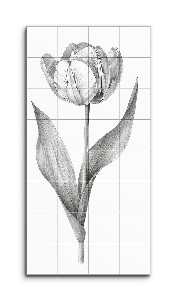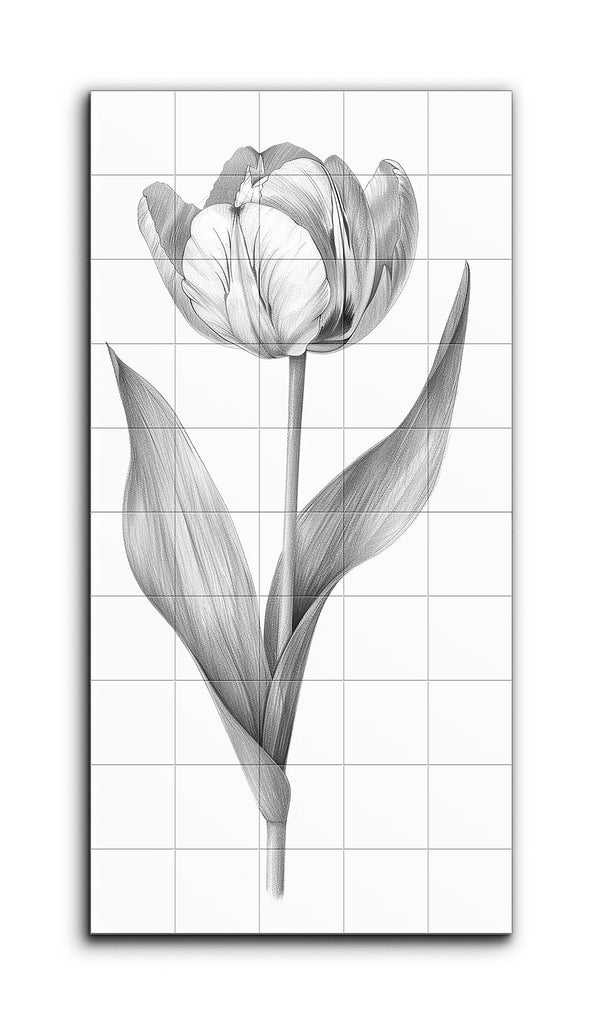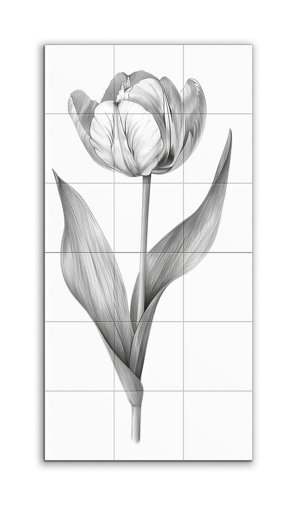 This tile mural features a detailed, monochromatic illustration of a tulip, rendered with precise, fine lines that emphasize the flower's texture and form. The intricately drawn petals show delicate veining and subtle shading, giving them a lifelike, three-dimensional appearance. Elongated, gracefully curved leaves with detailed striations complement the slender, straight stem. The highly realistic style, reminiscent of traditional botanical illustrations, uses black and white to enhance focus on form and texture, creating a timeless and elegant aesthetic.