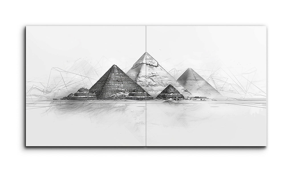 This two-panel diptych captures the timeless grandeur of the Egyptian pyramids in a monochromatic grayscale palette. Each pyramid is meticulously detailed, with visible stone textures and shadows that convey depth and solidity. Superimposed on this realistic portrayal are abstract geometric lines and shapes, drawn freely, hinting at a conceptual blueprint. The juxtaposition of ancient architecture with modern, technical elements creates a compelling dialogue between history and contemporary thought. This minimalist composition emphasizes both the tangible and the conceptual, offering a fresh perspective on a classic subject.