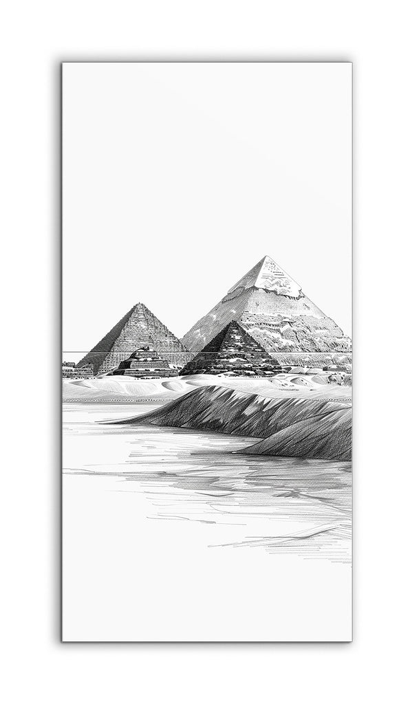 This monochromatic tile mural captures the grandeur of the Pyramids of Giza with intricate line work and meticulous hatching. Three pyramids dominate the composition, rendered with precise cross-hatching to create a three-dimensional effect. The foreground features flowing sand dunes, illustrated with fluid lines to evoke the shifting desert landscape. The black-and-white palette underscores the timelessness of the scene, while the detailed textures bring the ancient structures to life, making it a striking homage to a historic marvel.