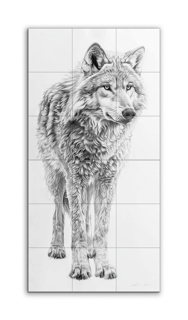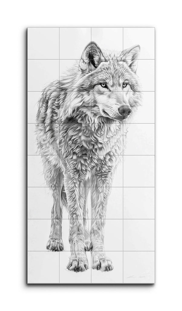 This tile mural showcases a highly detailed black and white drawing of a wolf. The wolf stands facing slightly to the right, its head turned towards the viewer. With meticulously rendered fur, the artwork captures intricate patterns and variations in shading, creating a lifelike appearance. The wolf's sharp, focused eyes add intensity, while fine lines and careful shading convey depth and contours. The realistic style, balanced composition, and timeless black and white palette highlight the natural beauty and intricate details of the wolf.