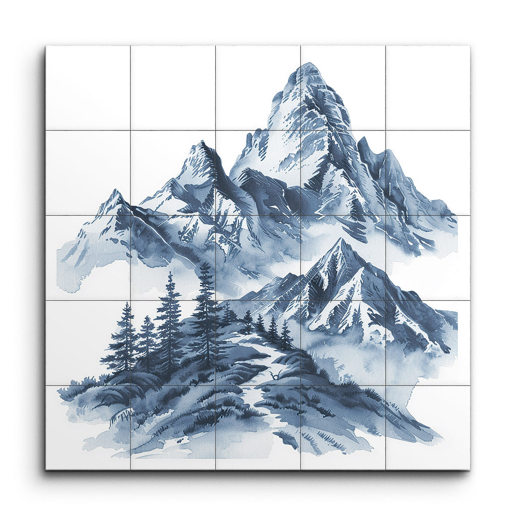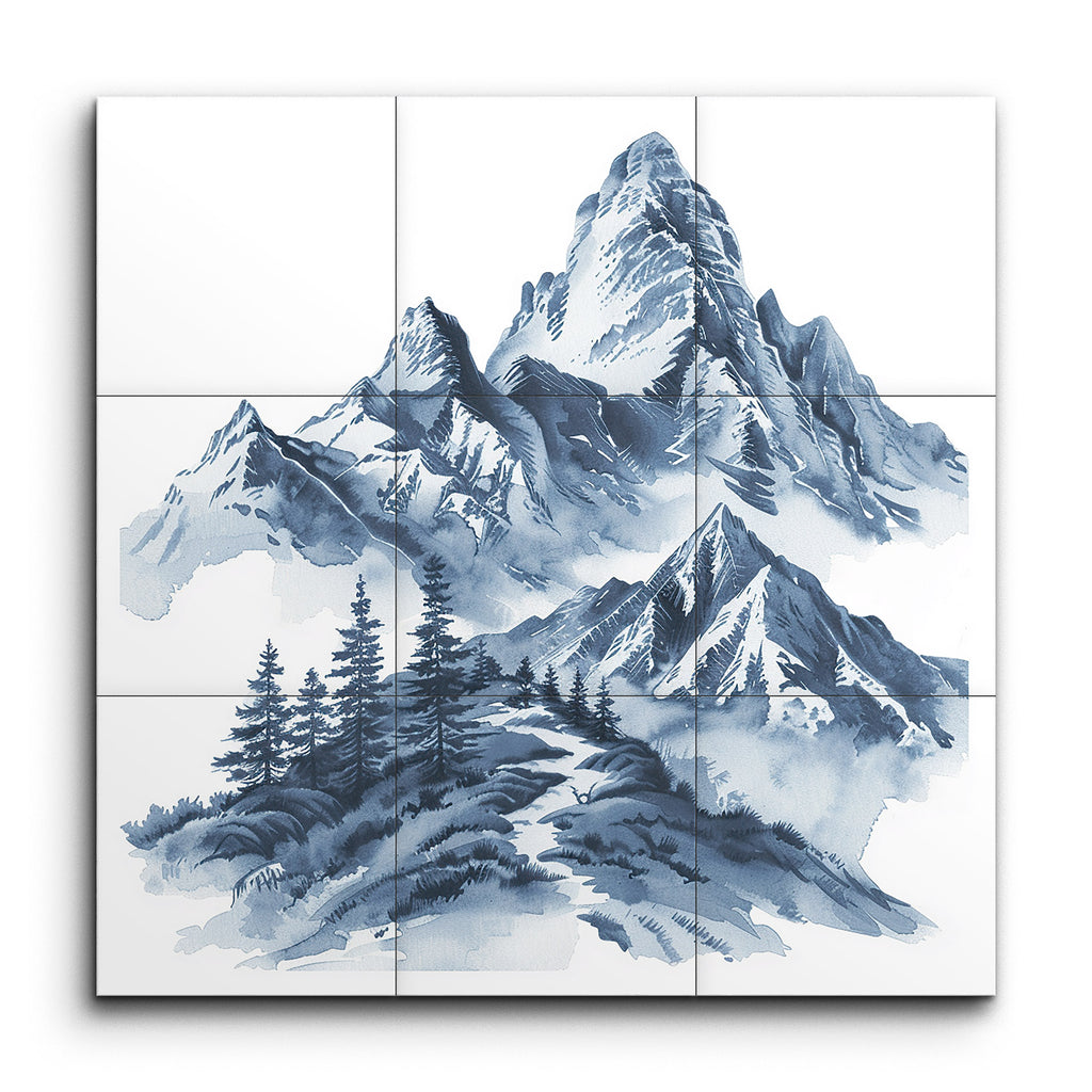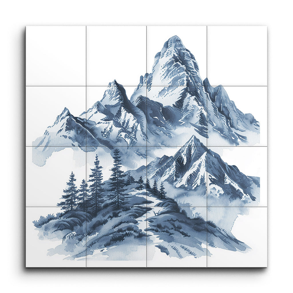 Immerse yourself in the serene beauty of this monochromatic blue tile mural, depicting a tranquil mountain landscape. A towering, jagged peak commands attention at the center, surrounded by cascading rugged mountains. The artist's watercolor technique creates soft gradients and fluid transitions, enhancing the ethereal feel. Delicate brushstrokes depict evergreen trees in the foreground, grounding the composition while maintaining an impressionistic quality. Reminiscent of traditional East Asian ink wash painting, this piece invites contemplation of nature's majesty.