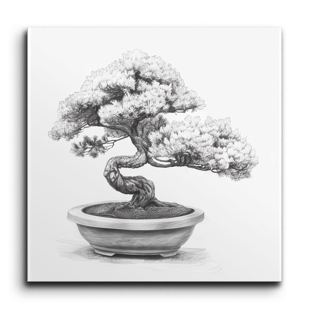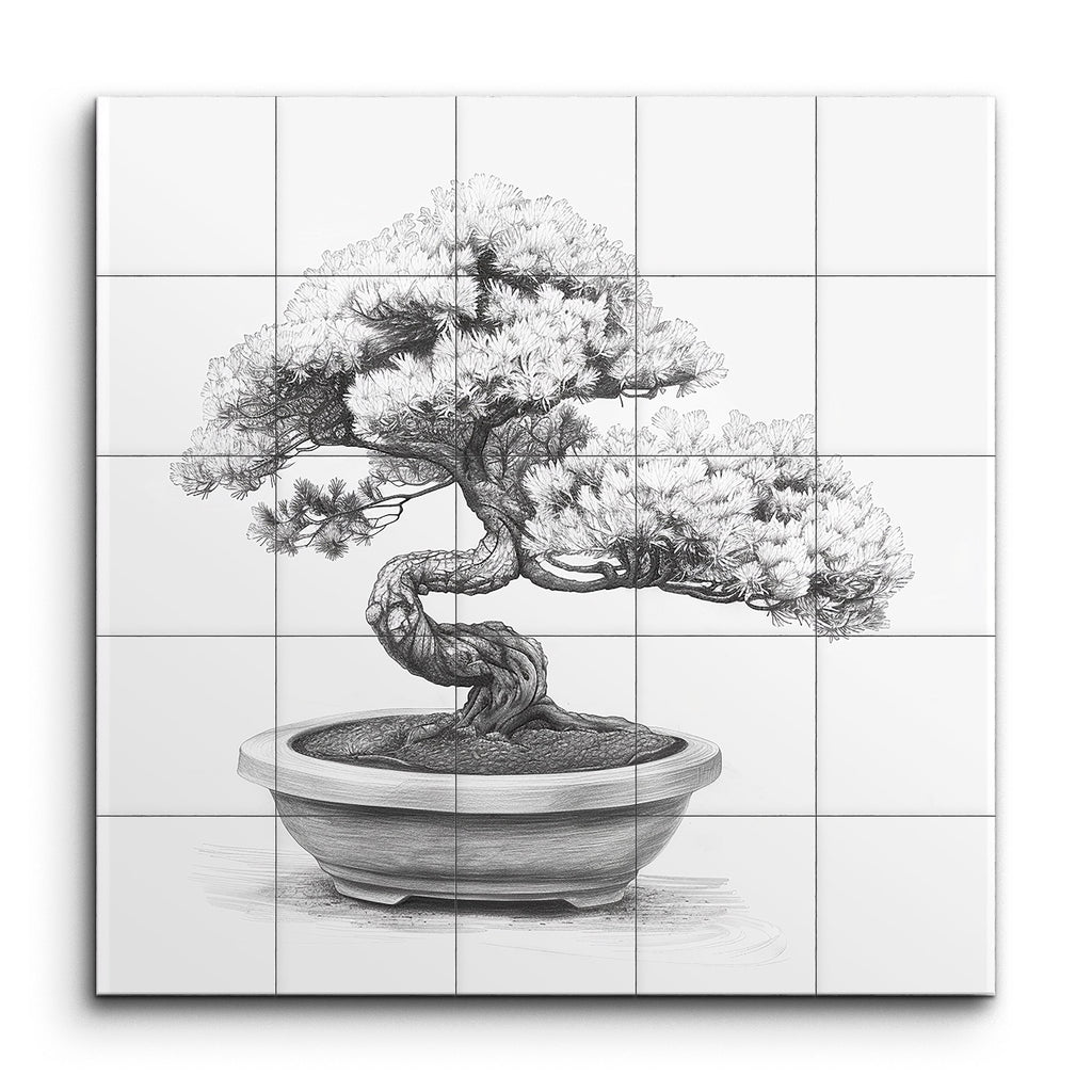 Immerse yourself in the tranquil beauty of this meticulously detailed bonsai tree tile mural. The gracefully twisted trunk and dense foliage, rendered with fine, delicate lines, capture the natural elegance and intricate growth patterns of bonsai cultivation. The simple, elegant pot grounds the composition, allowing the tree to take center stage. With a highly realistic style and monochrome tones, this artwork exudes a timeless, calming presence, reflecting the patience and skill required to nurture such a living masterpiece.