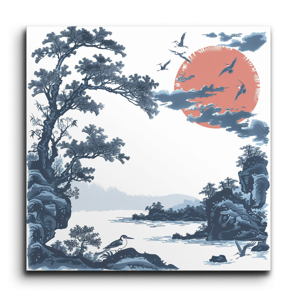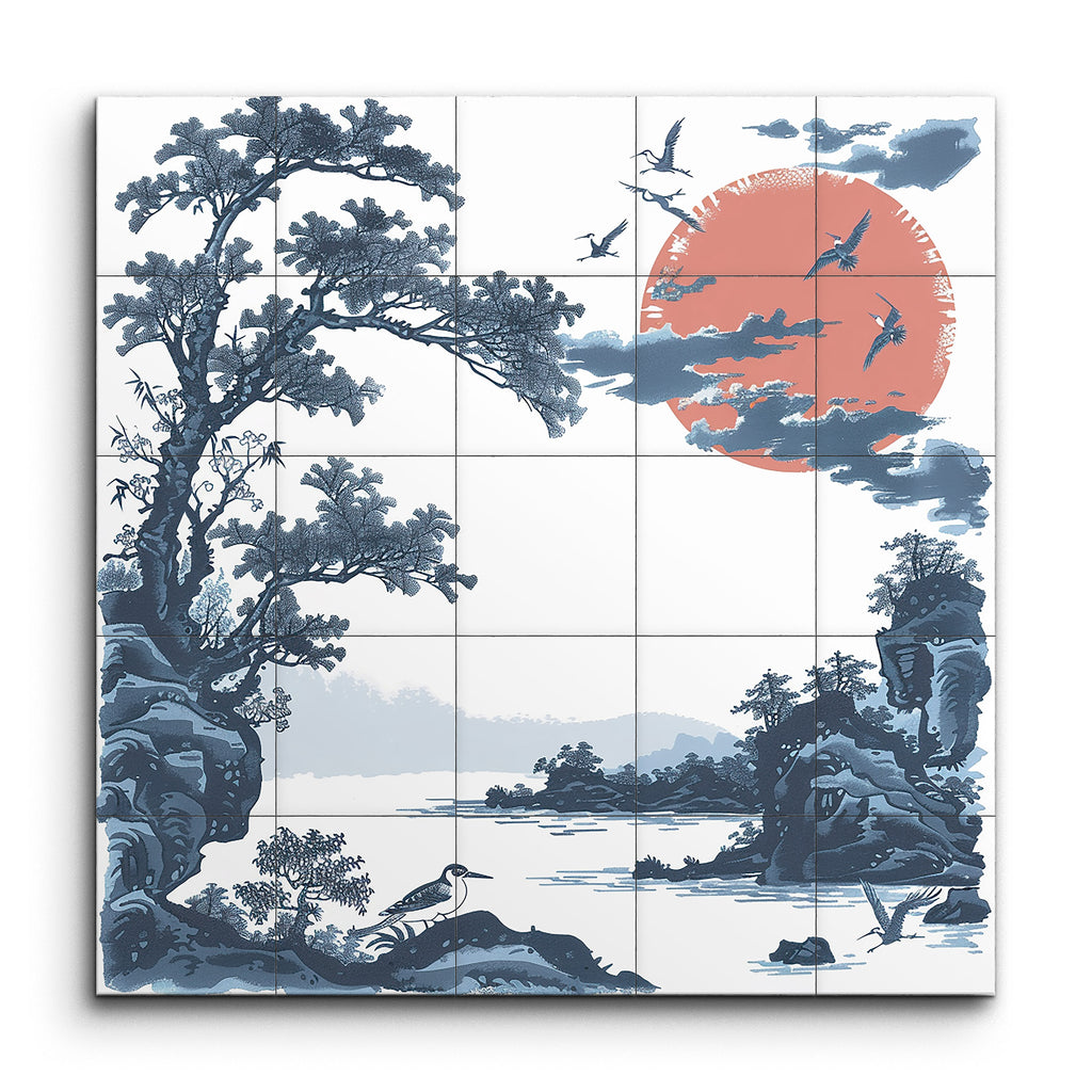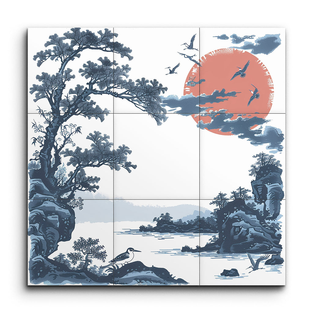 Immerse yourself in the tranquil beauty of this East Asian-inspired tile mural. A vibrant red sun, partially veiled by wispy clouds, stands in striking contrast to the serene blues and grays of the landscape. Delicate, twisting branches of craggy trees and rocky cliffs frame a calm body of water, reflecting the peaceful surroundings. Distant hills fade into a misty horizon, while birds in flight add life and harmony to the scene. This mural captures the essence of peace and natural beauty in every detail.