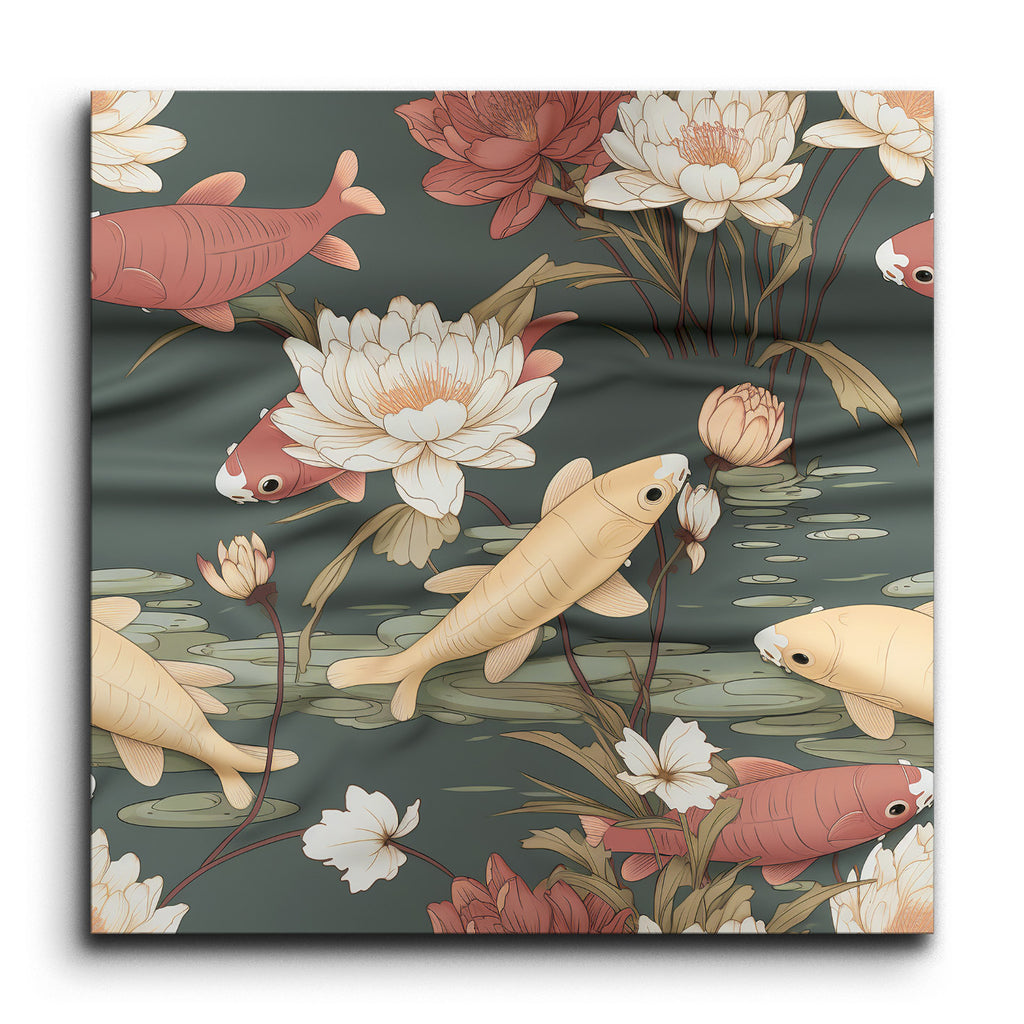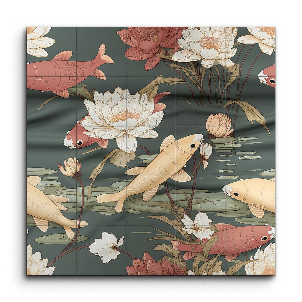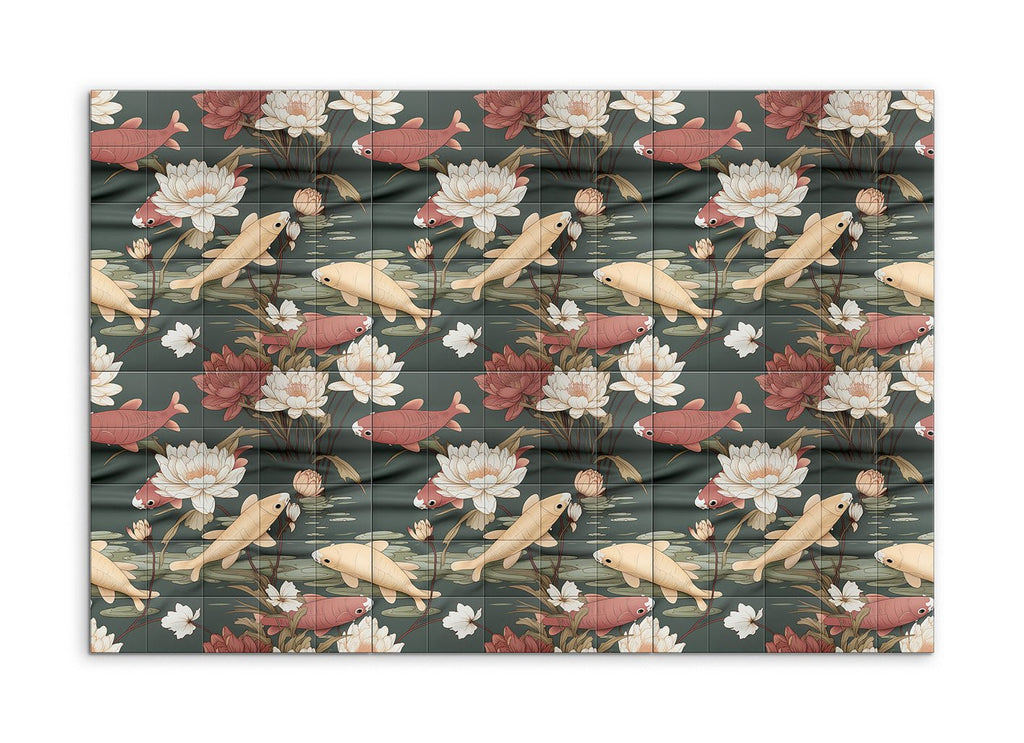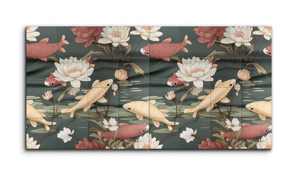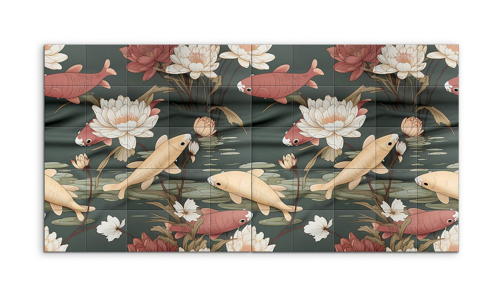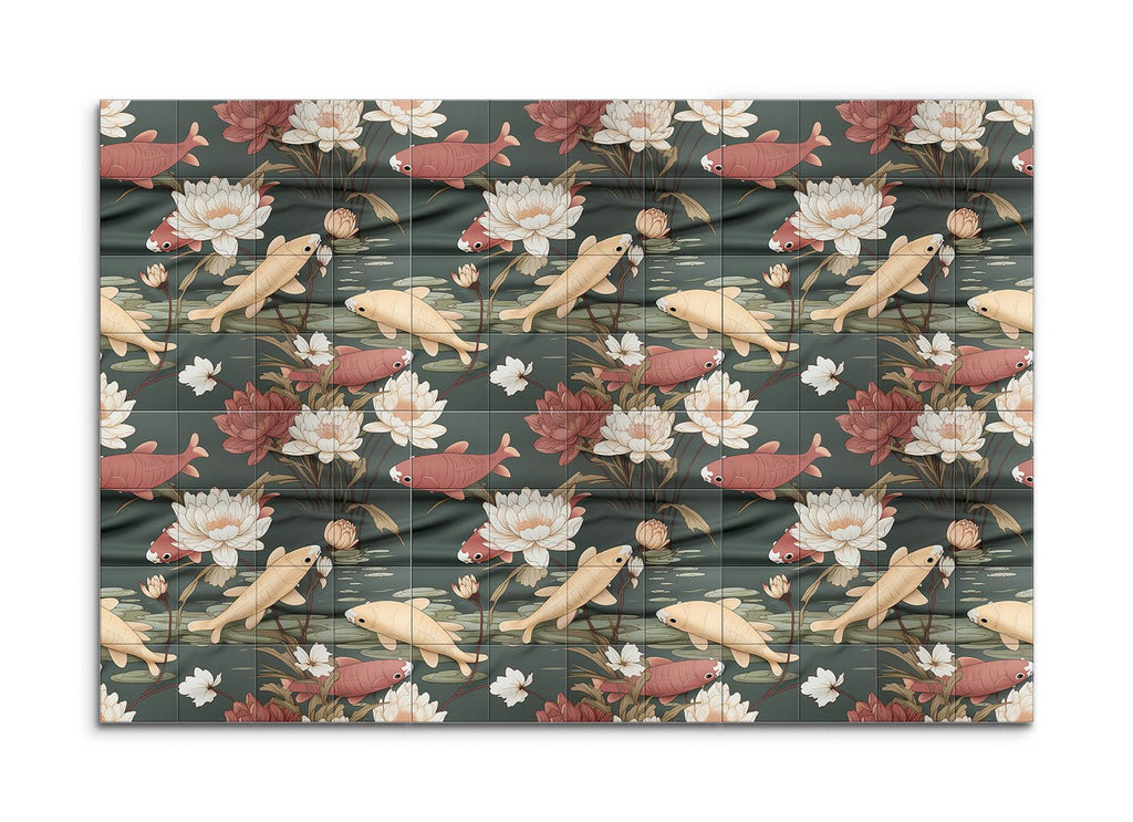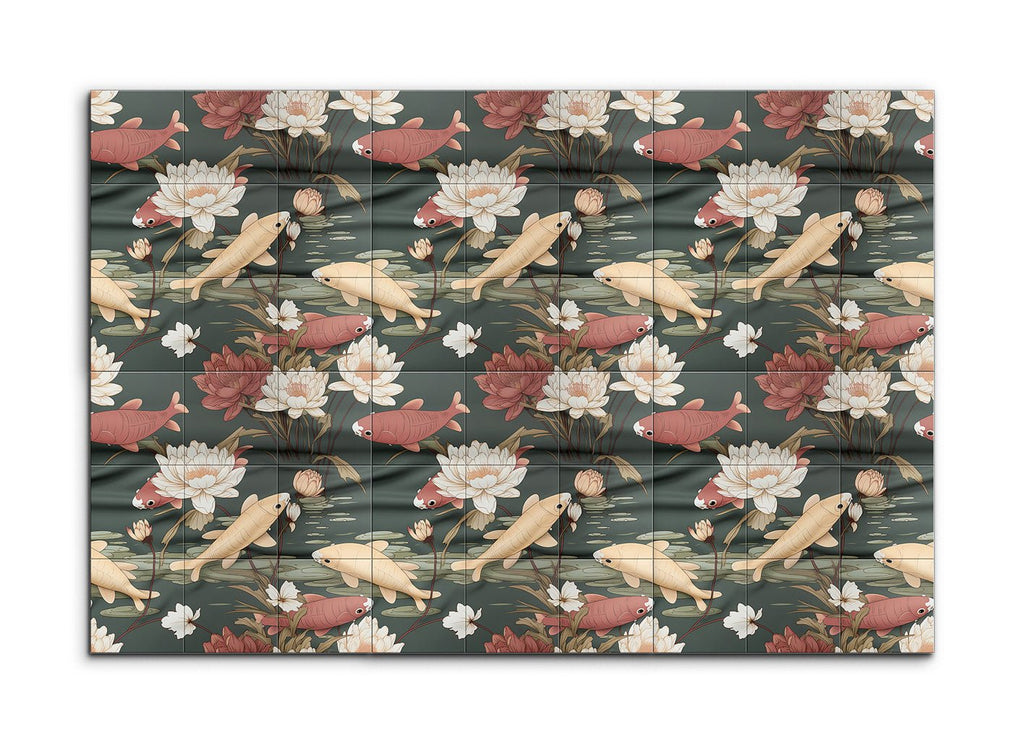 Immerse yourself in the tranquil beauty of this exquisite tile mural, capturing an enchanting underwater scene inspired by traditional East Asian art. Graceful koi fish, rendered in smooth, flowing lines and soft hues of red, orange, and pale yellow, swim elegantly among blooming water lilies. The intricate petals in shades of white and pink, along with slender green leaves, add depth and natural progression. Set against a muted dark green background, this serene composition evokes a sense of harmony and elegance.