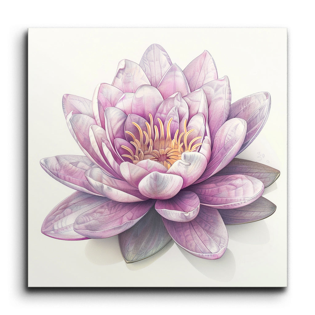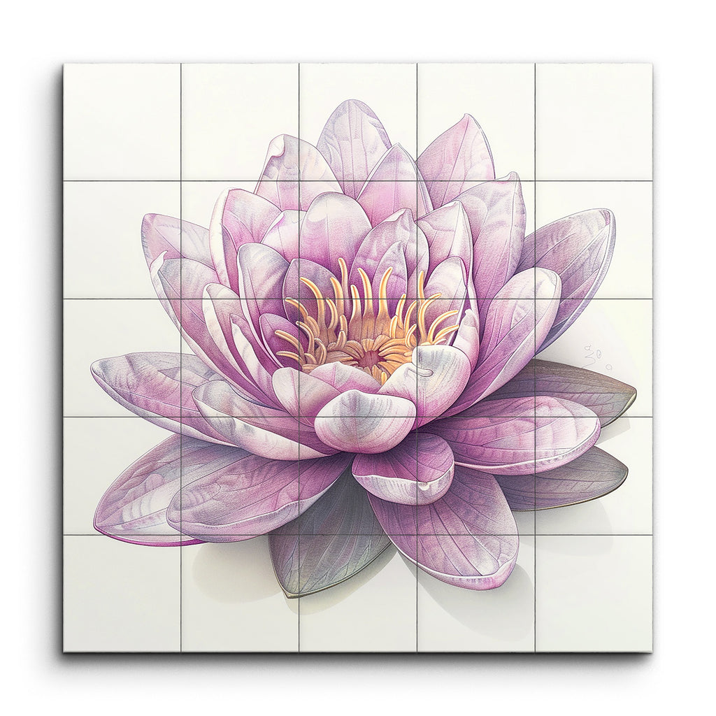 Immerse your space in tranquility with this stunning tile mural featuring a beautifully detailed lotus flower. The delicate petals, rendered in soft pastel shades of pink and purple, exhibit lifelike three-dimensional gradients and meticulous layering. Golden yellow stamens at the flower's center provide a vibrant contrast, enhancing the natural elegance of the composition. This artwork combines realism with a refined, illustrative style, creating a serene and sophisticated visual masterpiece.