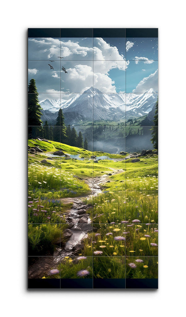 This tile mural presents a captivating natural landscape featuring a tranquil meadow that extends into the distance. A narrow, winding path in the foreground guides the viewer's gaze deeper into the scene, flanked by vibrant green grass and colorful wildflowers. The meadow transitions into a dense forest of tall pine trees, beyond which rise majestic snow-capped mountains against a partly cloudy sky. Soft lighting suggests early morning or late afternoon, adding depth and dimension to this meticulously detailed, realistic artwork.