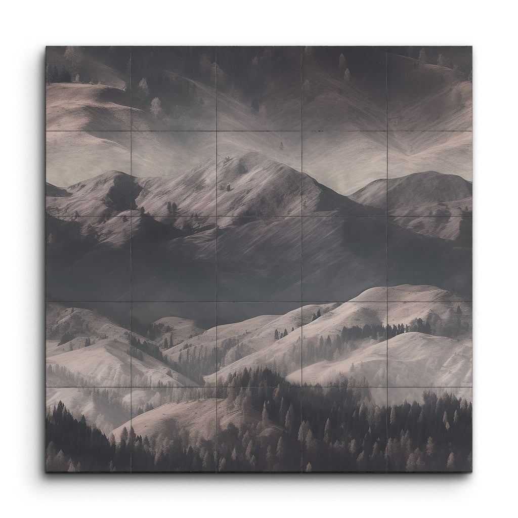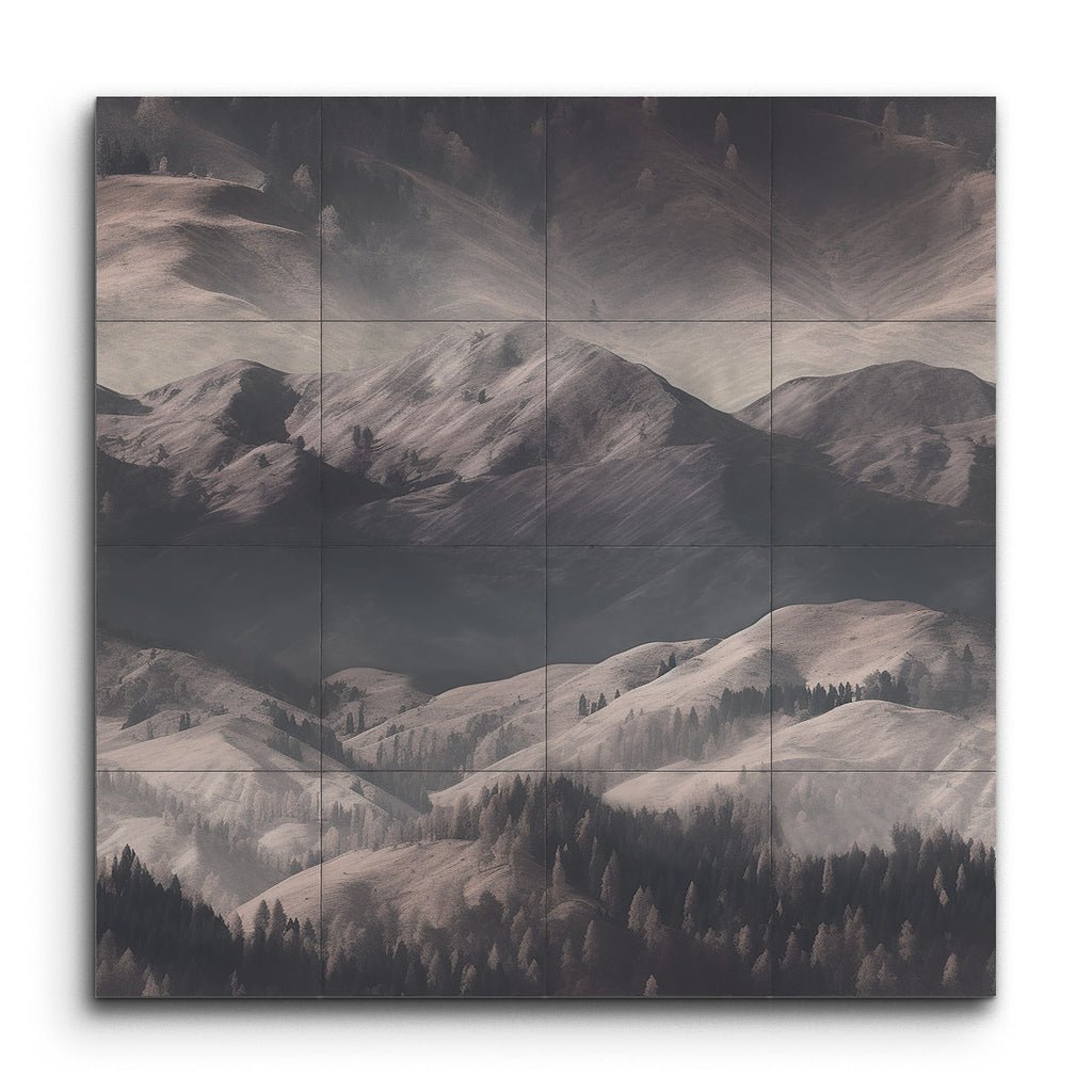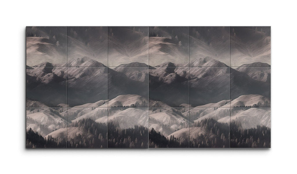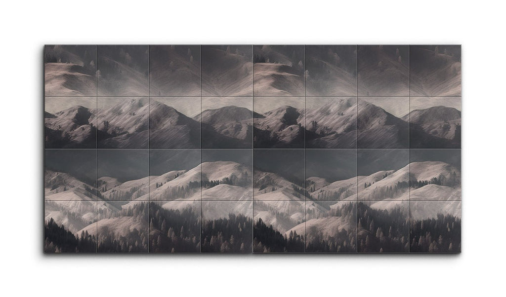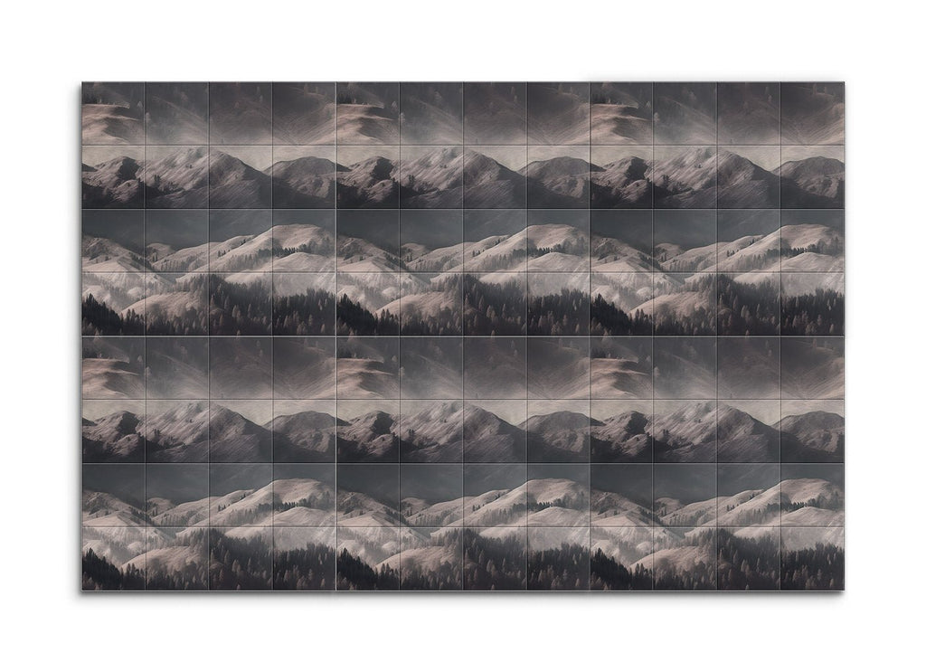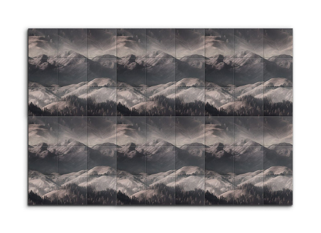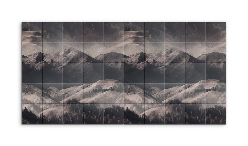 Immerse yourself in the tranquil beauty of a serene, mountainous landscape with this exquisite tile mural. Rendered in a muted, monochromatic palette of grays and soft browns, the artwork captures rolling hills and rugged peaks, creating a profound sense of depth and vastness. Dense clusters of dark coniferous trees in the foreground gradually give way to mist-shrouded mountains, adding a touch of mystery. The impressionistic style, with its soft focus and masterful use of light and shadow, evokes a calming and contemplative atmosphere.