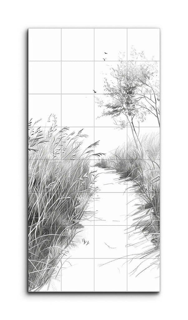 This tile mural captures a tranquil natural scene in monochromatic shades of gray. A narrow path meanders through tall, dense grasses, inviting the viewer's eye to explore deeper into the artwork. Intricate details in the grasses and the slender tree with sparse foliage on the right add texture and depth. Delicate birds in flight bring a touch of movement and life. The minimalist, detailed line work and subtle shading create a serene and elegant atmosphere, highlighting the beauty of the landscape.