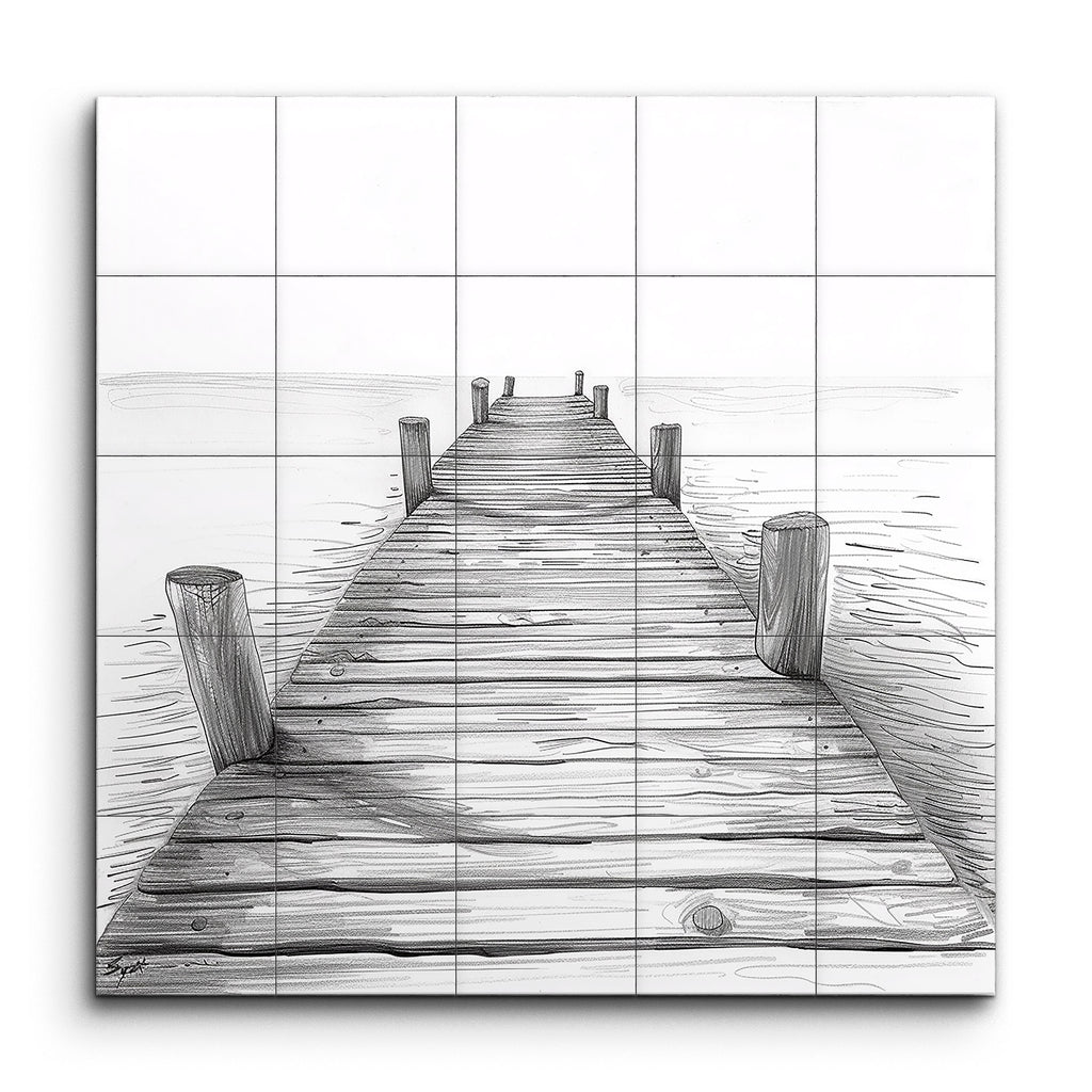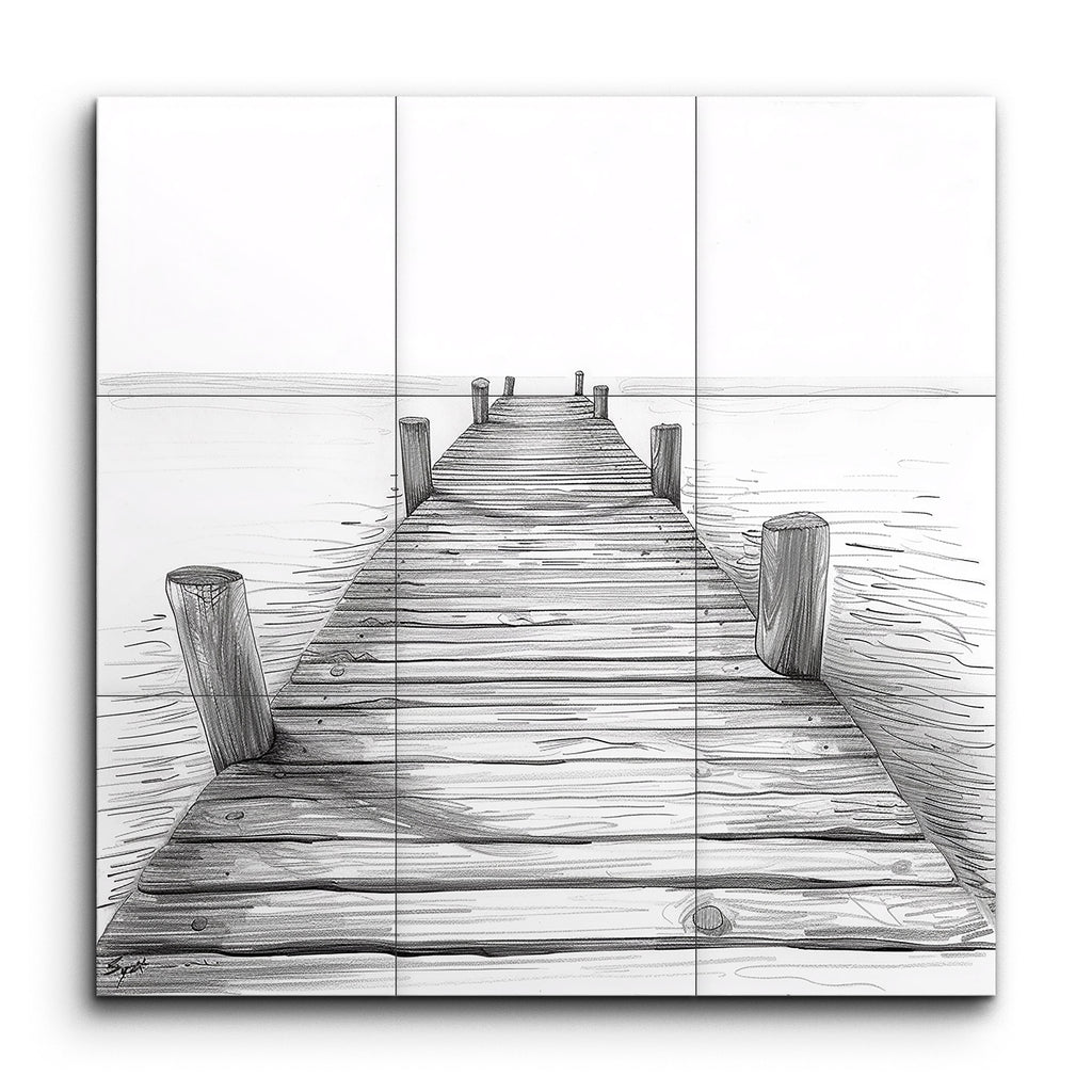 Transform your space with this captivating tile mural featuring a minimalist, monochromatic depiction of a wooden pier extending into tranquil waters. The detailed line work showcases the wood grain and texture, while the perspective creates a compelling sense of depth and distance. The calm, horizontal lines of the water and the subtle shadows of the pier's posts enhance the three-dimensional effect. This serene and contemplative artwork brings a touch of peaceful elegance to any setting.