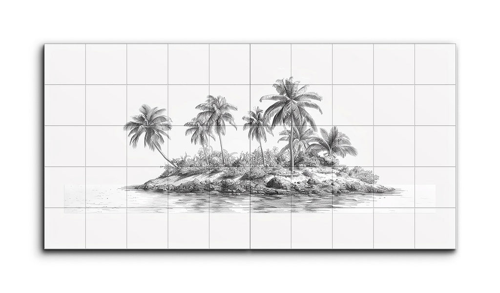 This tile mural showcases a small tropical island enveloped by calm waters. The island is lush with palm trees of varying heights, intricately detailed to appear lifelike. Dense foliage and smaller plants add to the scene's richness. The rocky terrain is shaded for depth, while gentle water ripples reflect the serene island. The monochromatic color scheme, fine lines, and shading techniques create a realistic, almost three-dimensional appearance, resulting in a harmonious and tranquil composition.