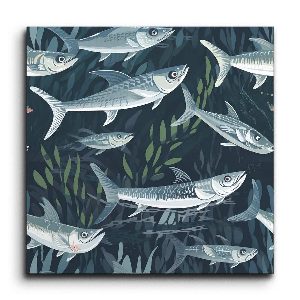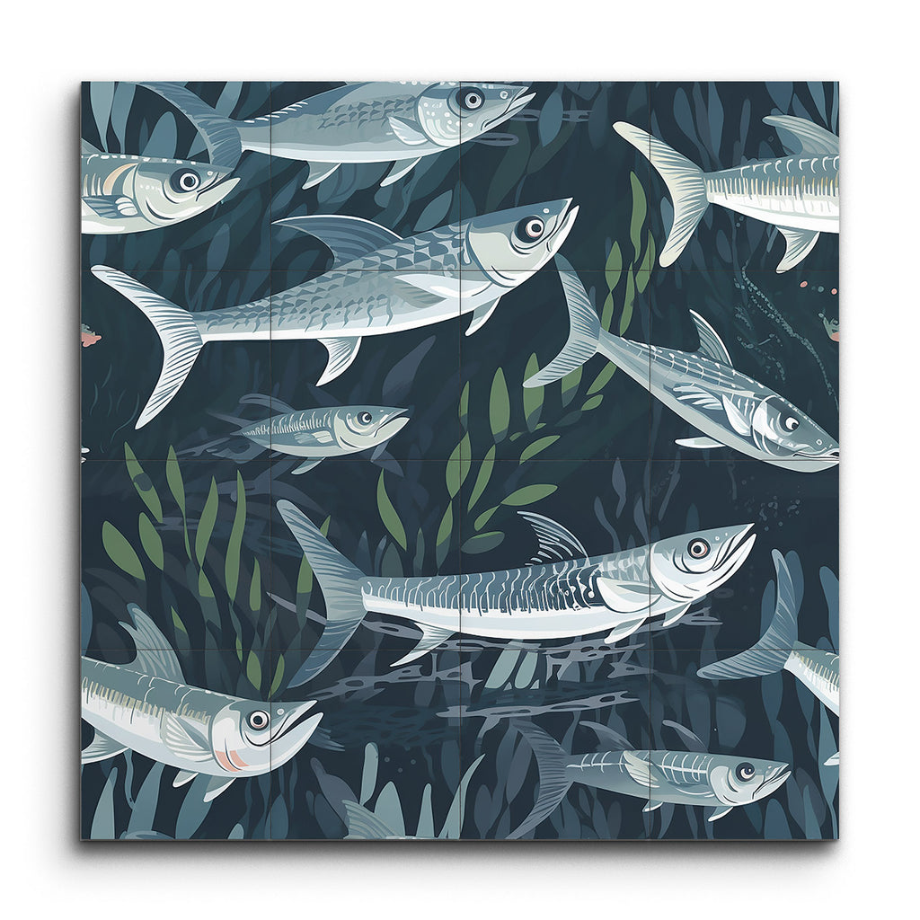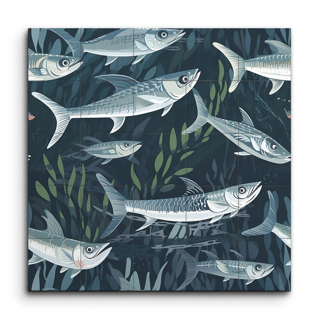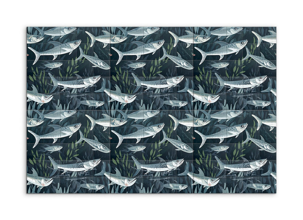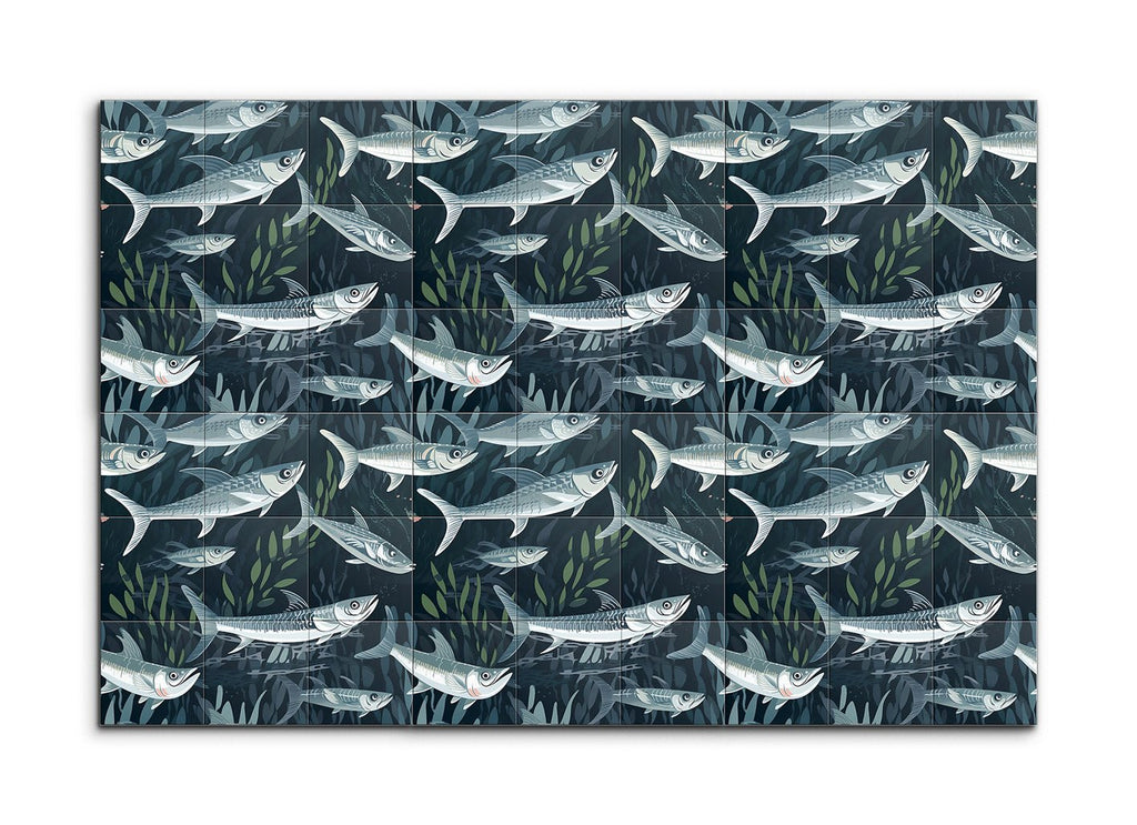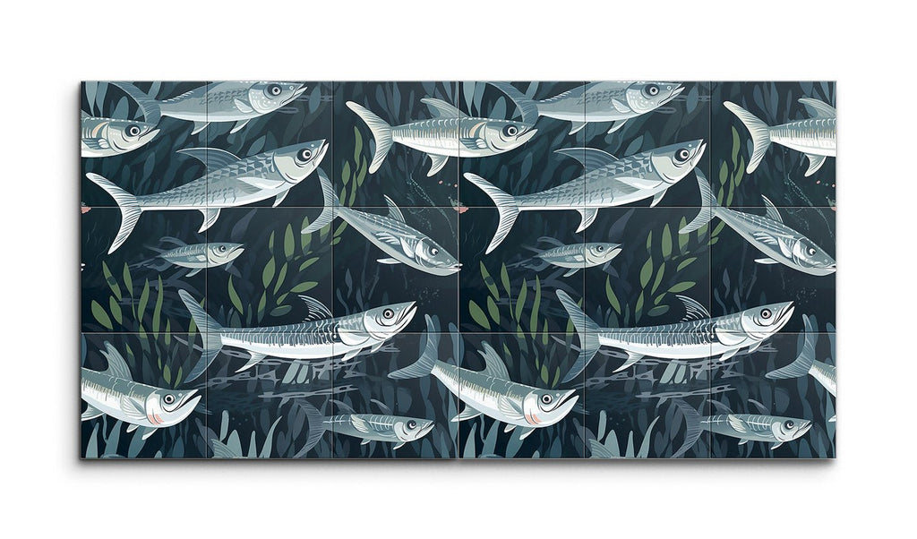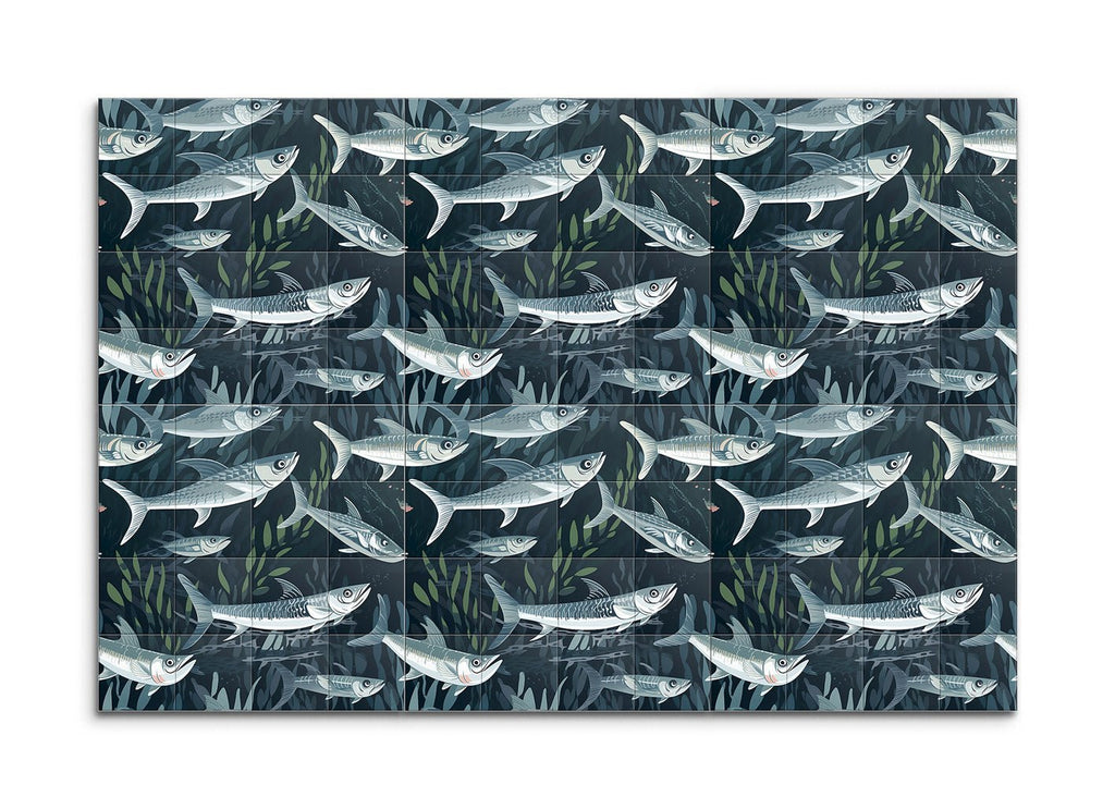 Immerse yourself in the tranquility of the ocean with our stunning tile mural, capturing a dynamic underwater scene where a school of fish swims gracefully amidst aquatic plants. Each fish is intricately detailed, showcasing their streamlined bodies and scales, brought to life with cool shades of blue and gray, accented by subtle highlights of white and light green. The modern, semi-realistic style with clean lines and flowing shapes creates a sense of motion and depth, making this mural a captivating centerpiece for any space.