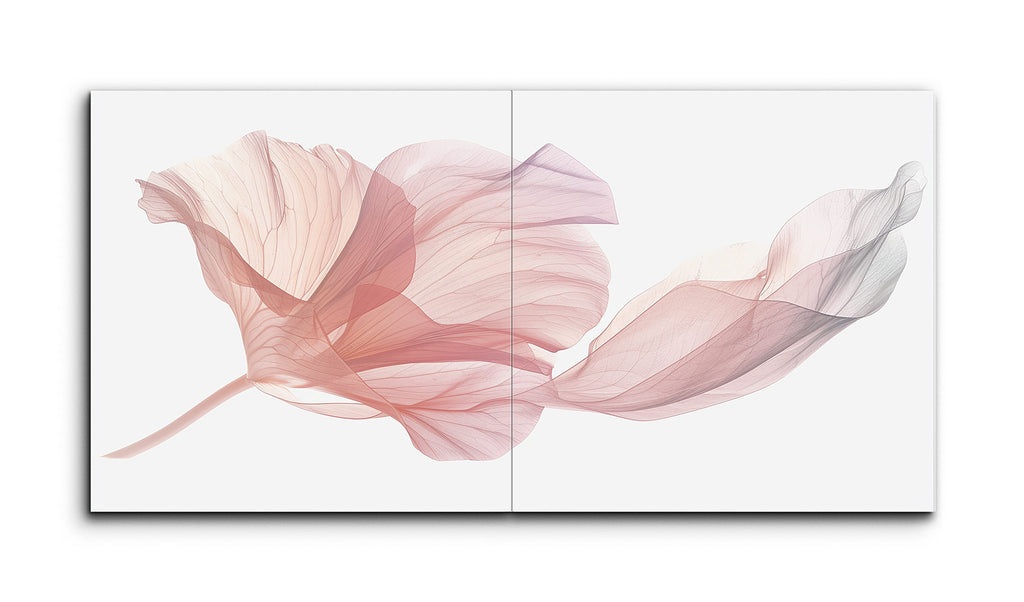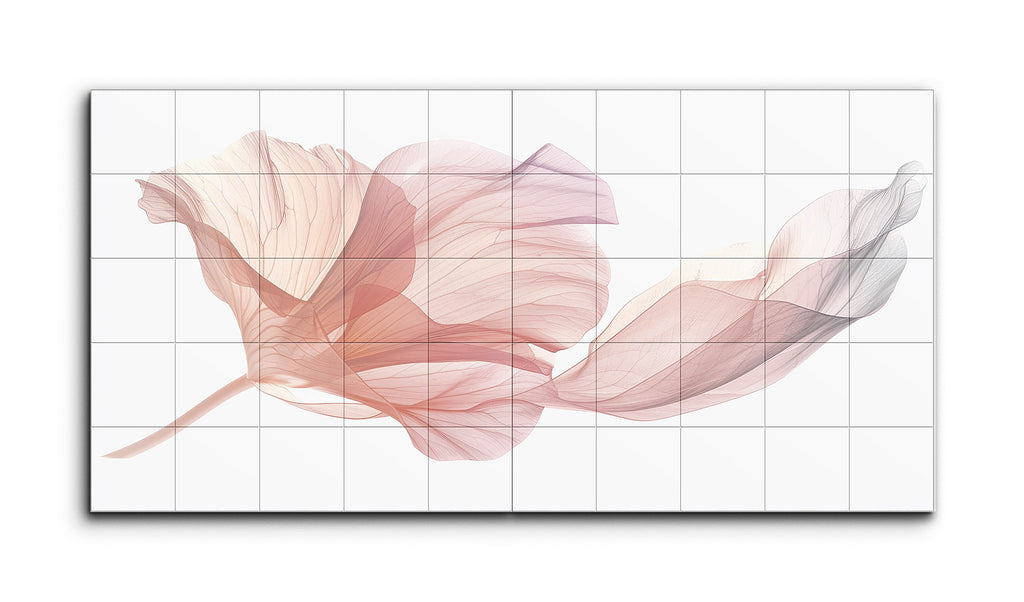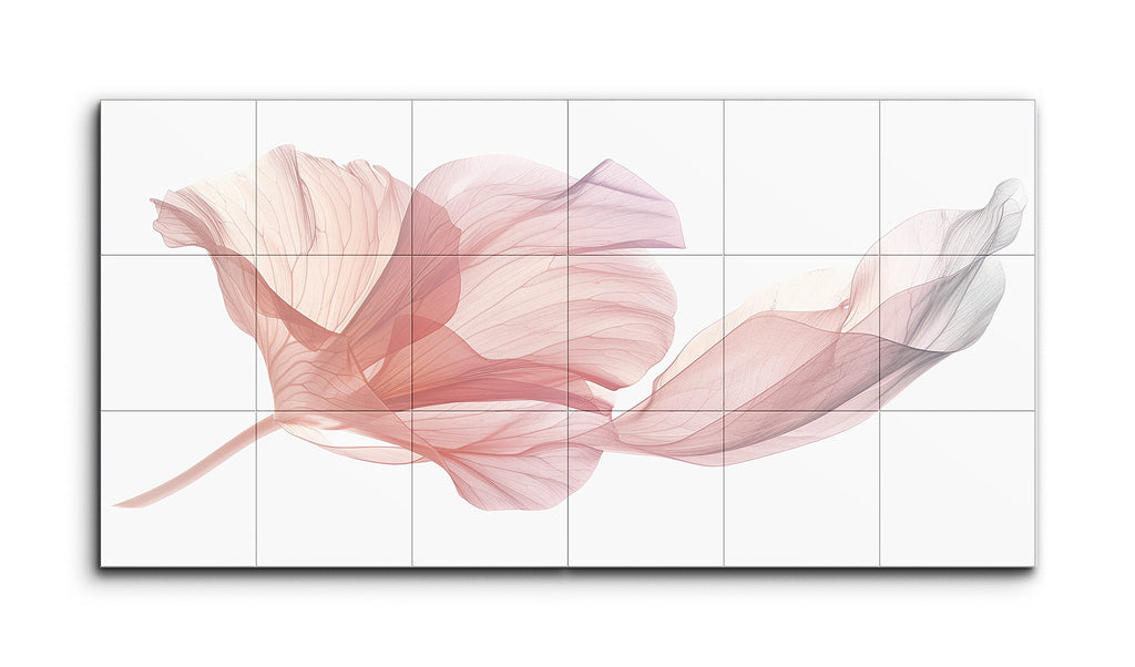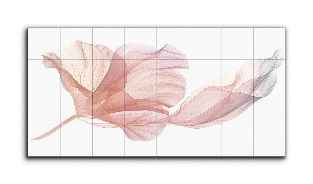 This diptych tile mural showcases a stylized, translucent flower in delicate pastel hues of pink and peach. The ethereal petals, rendered with gentle curves and subtle overlaps, seem almost sheer, allowing light to pass through and creating a soft, graceful effect. The minimalist, contemporary style emphasizes the flower's purity of form and color, inviting viewers to appreciate its delicate structure. The piece exudes tranquility and elegance, capturing the essence of the flower in a serene and poetic manner.