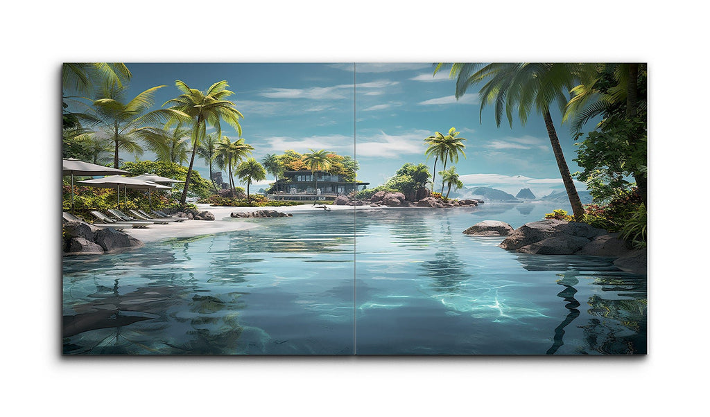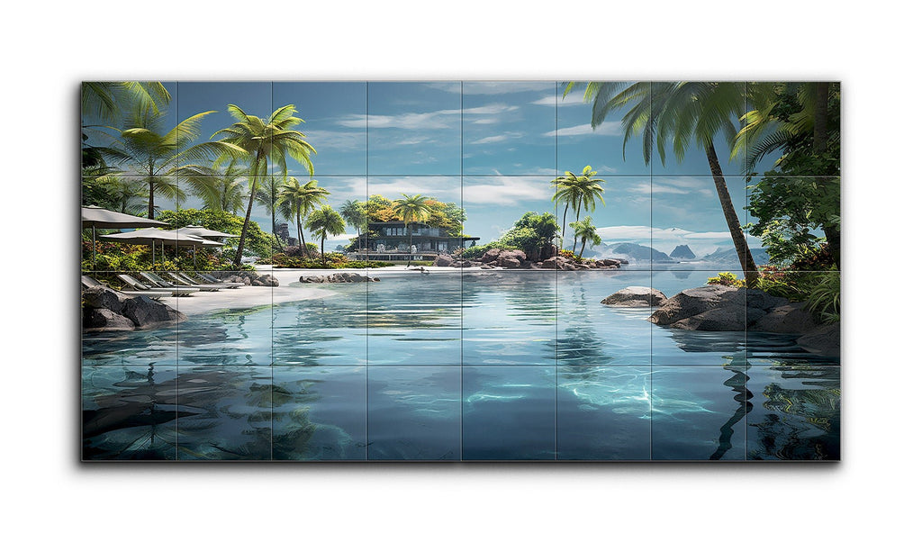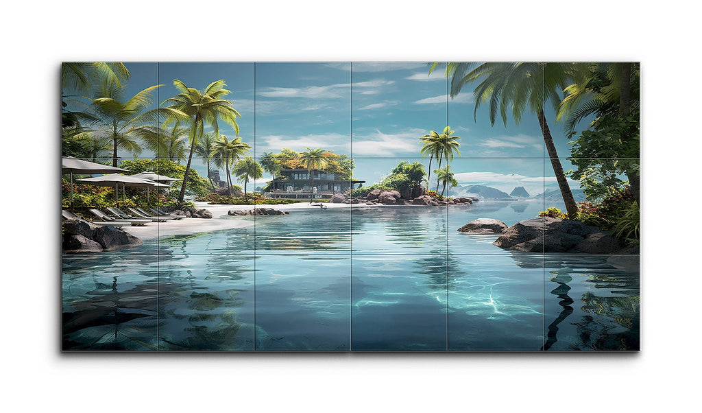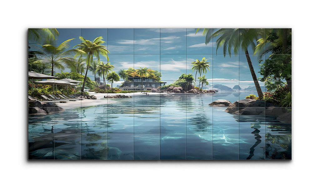 This tile mural showcases a serene tropical beach scene, featuring a crystal-clear turquoise body of water that deepens into a darker blue. On the left, a sandy beach lined with lush palm trees and sun loungers evokes a resort-like ambiance. A modern villa perched on a rocky outcrop is surrounded by tropical vegetation, offering a secluded retreat. Distant rocky formations and islands add depth, while a clear blue sky with wispy clouds completes the tranquil, highly realistic composition.