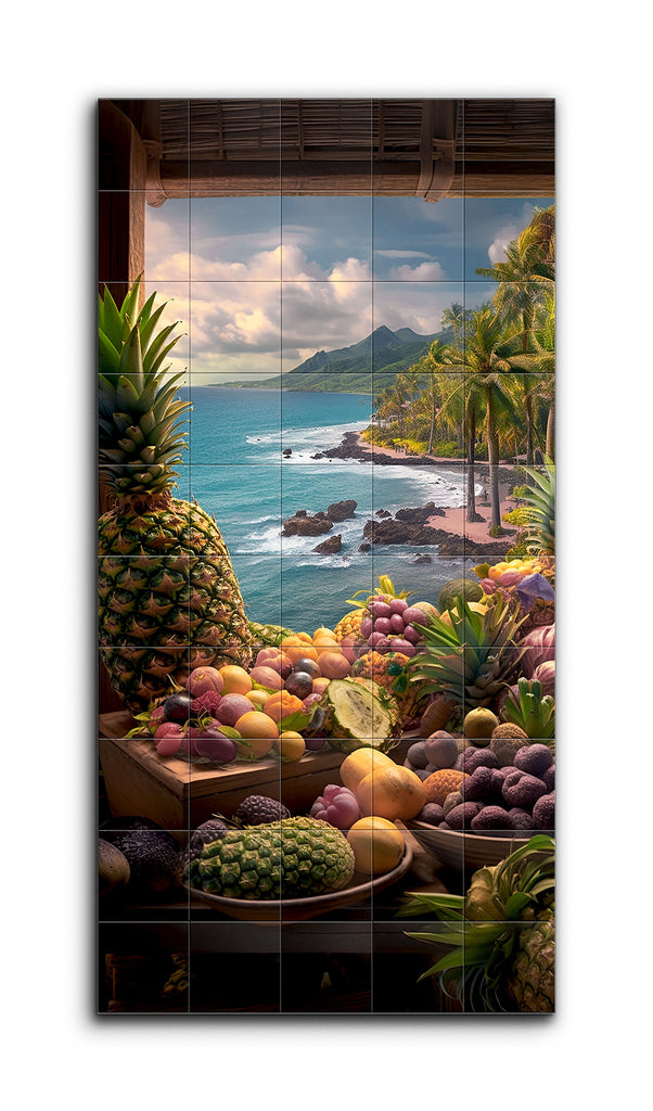 This tile mural presents a vibrant tropical scene that combines still life with landscape. The foreground features a detailed array of tropical fruits like pineapples, mangoes, and papayas, bursting with rich textures and vivid colors. Beyond the fruits, a serene turquoise ocean meets a rocky shoreline, with waves in mid-motion. Palm trees sway along the coast, leading to distant mountains under a partly cloudy sky. The highly realistic style and intricate play of light and shadow create a captivating sense of depth.