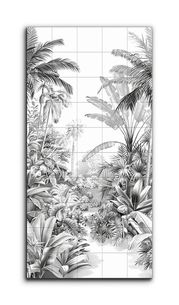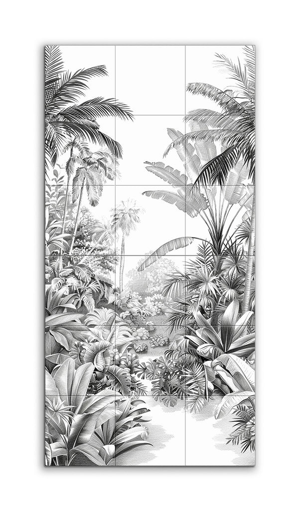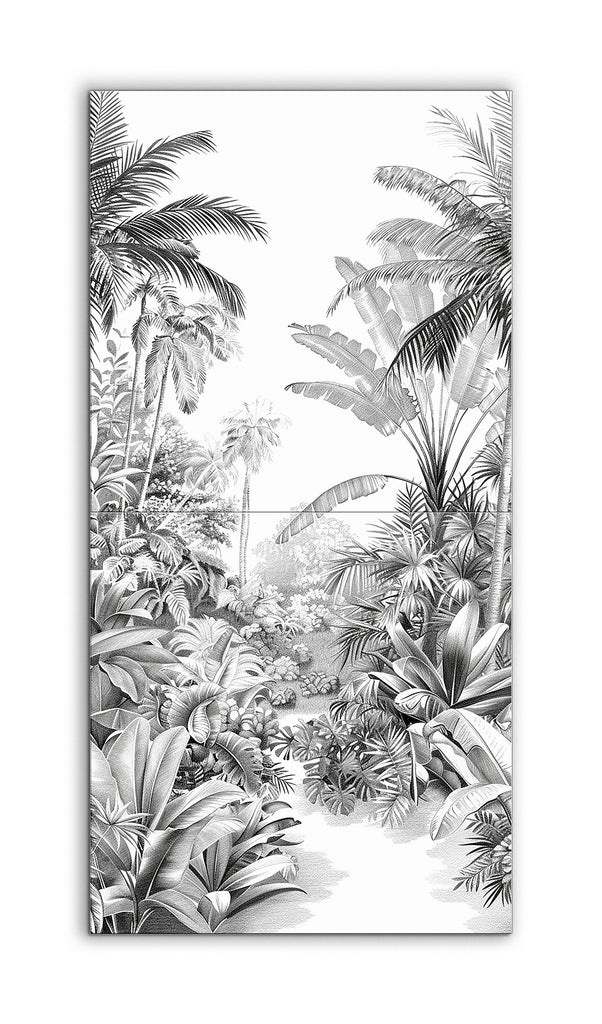 This detailed black-and-white illustration captures the essence of a lush tropical jungle. The scene is densely packed with various tropical plants and trees, creating a rich and deep composition. Foreground elements include large, intricately detailed leaves and fronds, resembling banana plants and other tropical flora. The middle ground is filled with smaller plants, adding layers and depth, while the background features tall palm trees and towering plants, forming a canopy. The fine lines and shading provide a realistic, three-dimensional effect, reminiscent of classic botanical illustrations.