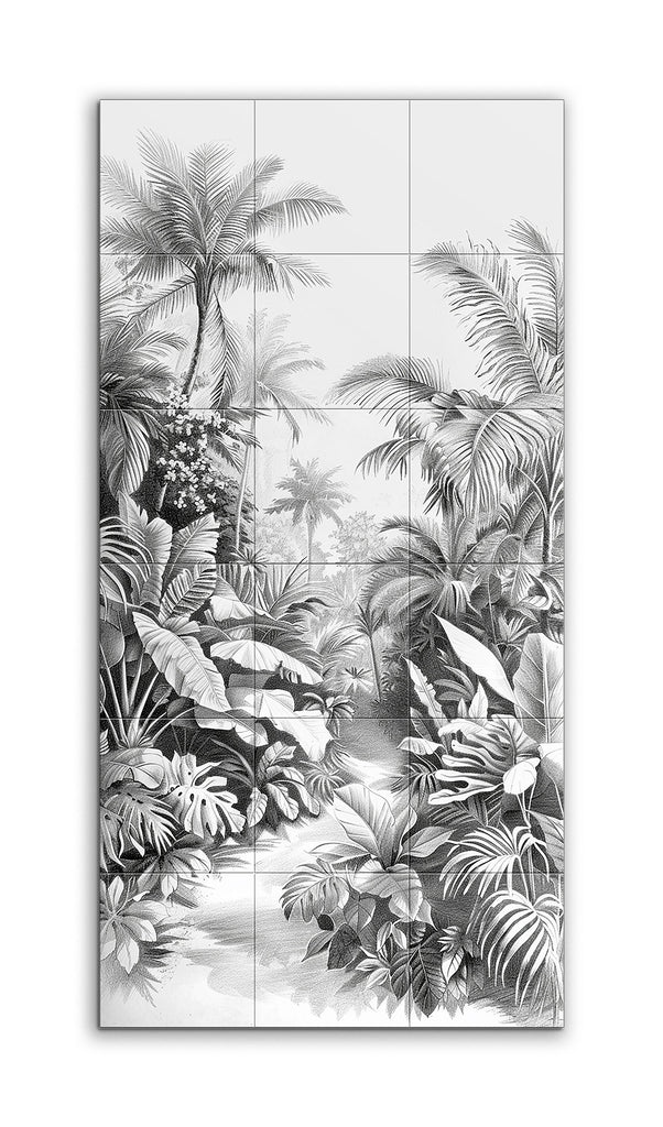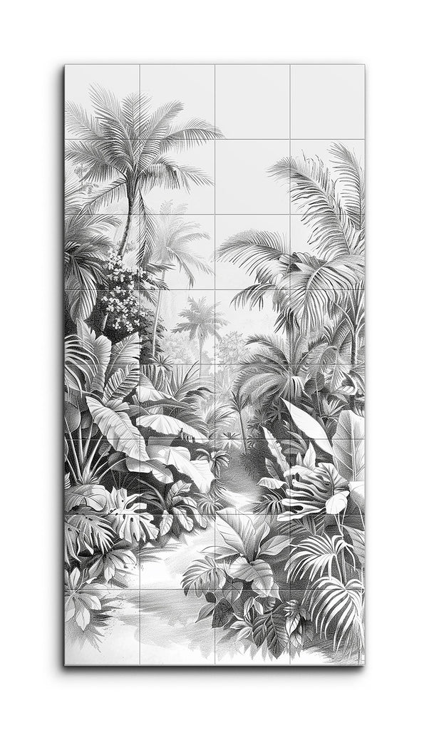 This tile mural showcases a detailed monochromatic illustration of a lush tropical jungle. The foreground features large, broad-leafed plants like monstera and banana leaves, intricately detailed with visible veins. The middle ground is filled with overlapping foliage, adding depth and complexity. Tall palm trees dominate the background, their slender trunks and feathery fronds reaching upwards. The grayscale tones emphasize the intricate details and textures, creating a timeless, realistic depiction of natural beauty.