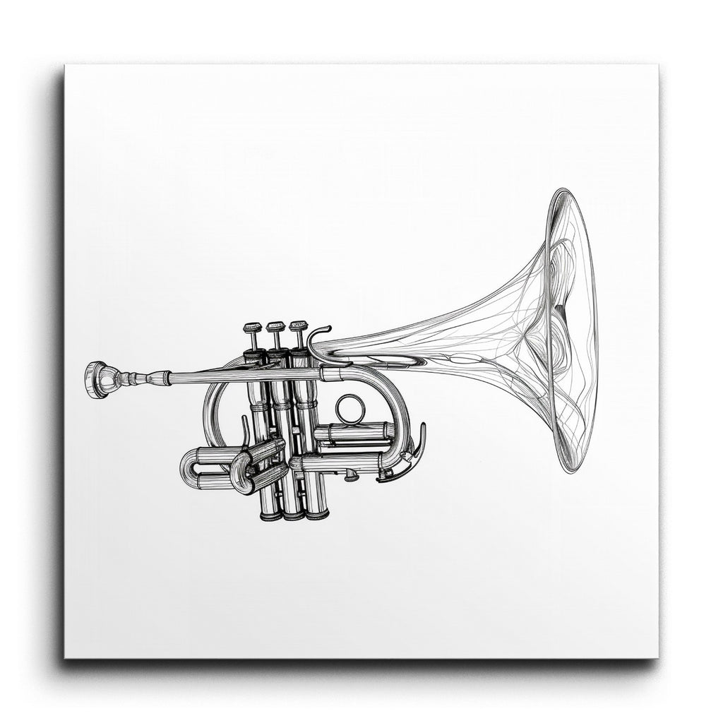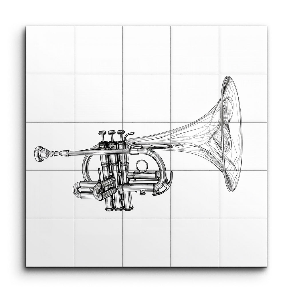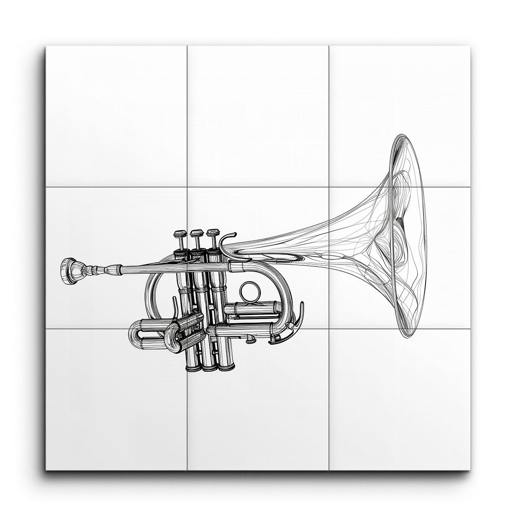 Elevate your space with our captivating tile mural featuring a meticulously detailed line drawing of a trumpet. This minimalist, technical artwork showcases the intricate beauty and mechanical elegance of the instrument. The precise, clean lines and varying thicknesses create a blueprint-like aesthetic, highlighting the trumpet's mouthpiece, valves, and bell from a striking side view. Perfect for music enthusiasts and art lovers alike, this mural adds a modern, sleek touch to any room.