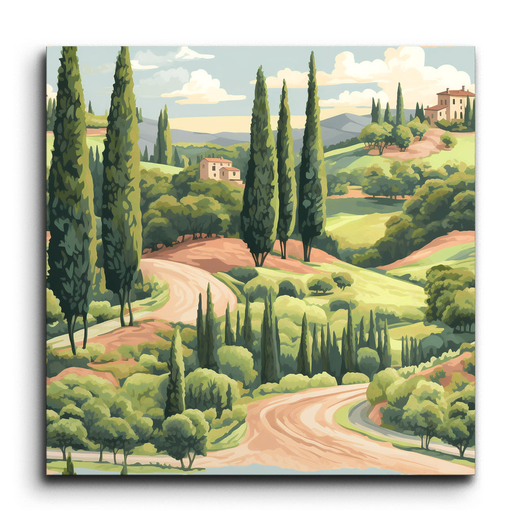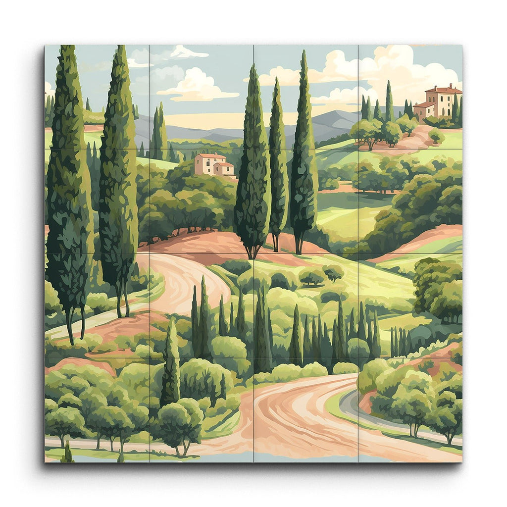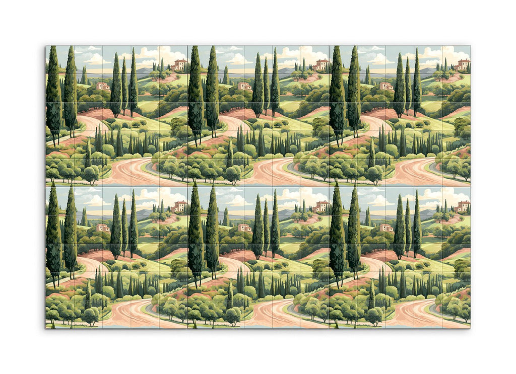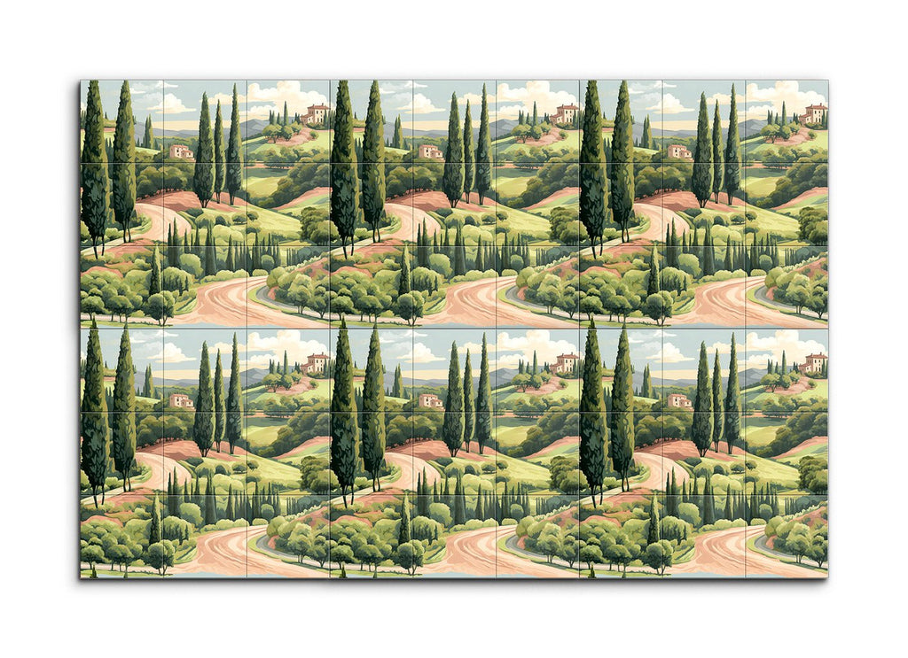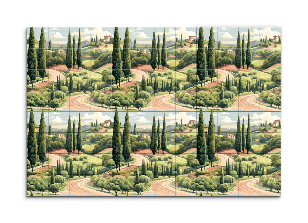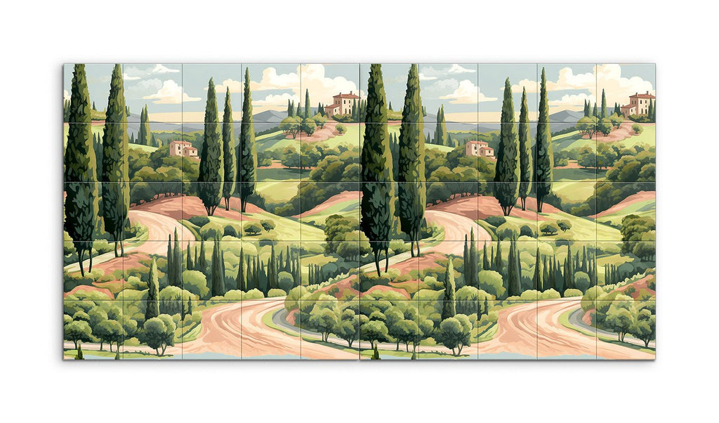 Transform your space with this captivating tile mural, showcasing a serene Tuscan landscape. Gently rolling hills covered in lush greenery and dotted with iconic cypress trees create a picturesque setting. A winding dirt road leads the eye to charming houses nestled among the hills, under a tranquil sky of soft blues and whites. The slightly stylized and illustrative approach lends a timeless, evocative charm, capturing the essence of Tuscany's natural beauty and inviting calm.
